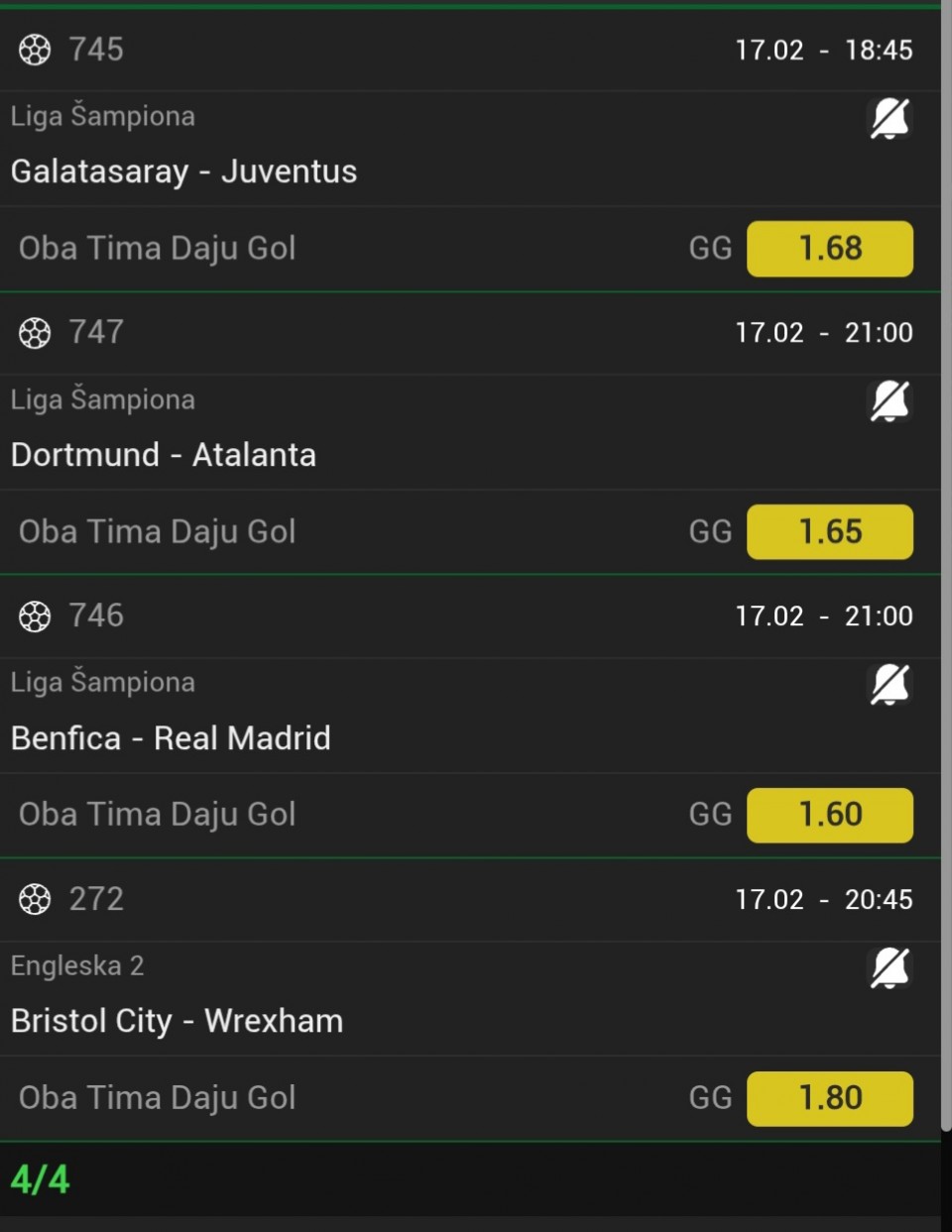 Galatasaray-Juventus - 1x over1.5 , Galata ima odlican ucinak na domacen terenu , dok juve dolazi poslije teskog gostovanja. Uzimajuci u obzir prednost domaceg terena i jauka 50000 turaka , domacin ne bi trebao izgubiti ovaj mec. Dortmund -...Galatasaray-Juventus - 1x over1.5 , Galata ima odlican ucinak na domacen terenu , dok juve dolazi poslije teskog gostovanja. Uzimajuci u obzir prednost domaceg terena i jauka 50000 turaka , domacin ne bi trebao izgubiti ovaj mec. Dortmund - Atalanta - 1 , Borussia je imala uspješan niz iza sebe i ulaze u laganu formu, atalanta vrlo varljiva ove sezone , jako loša odbrana , ne lice na onu ekipu unazad godinu-dve. Monaco - PSG - 2 , bez puno polemike za ovaj par .Monaco kritican ove sezone, velika razlika u kvaliteti ove dve ekipe , mislim da ce se psg napokon uozbiljiti i isprašiti mrežu domacina. Show more