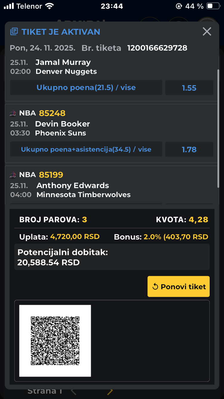 Vratio se nakon duzeg izostanka i odigrao odlicnu utakmicu, prosek mu je negde na 14 ove sezone sto se poena tice Asistencije oko 3 tako da bi trebalo da udje bez problema ocekujem...Evo nesto i od mene kada se vec predlaze NBA.