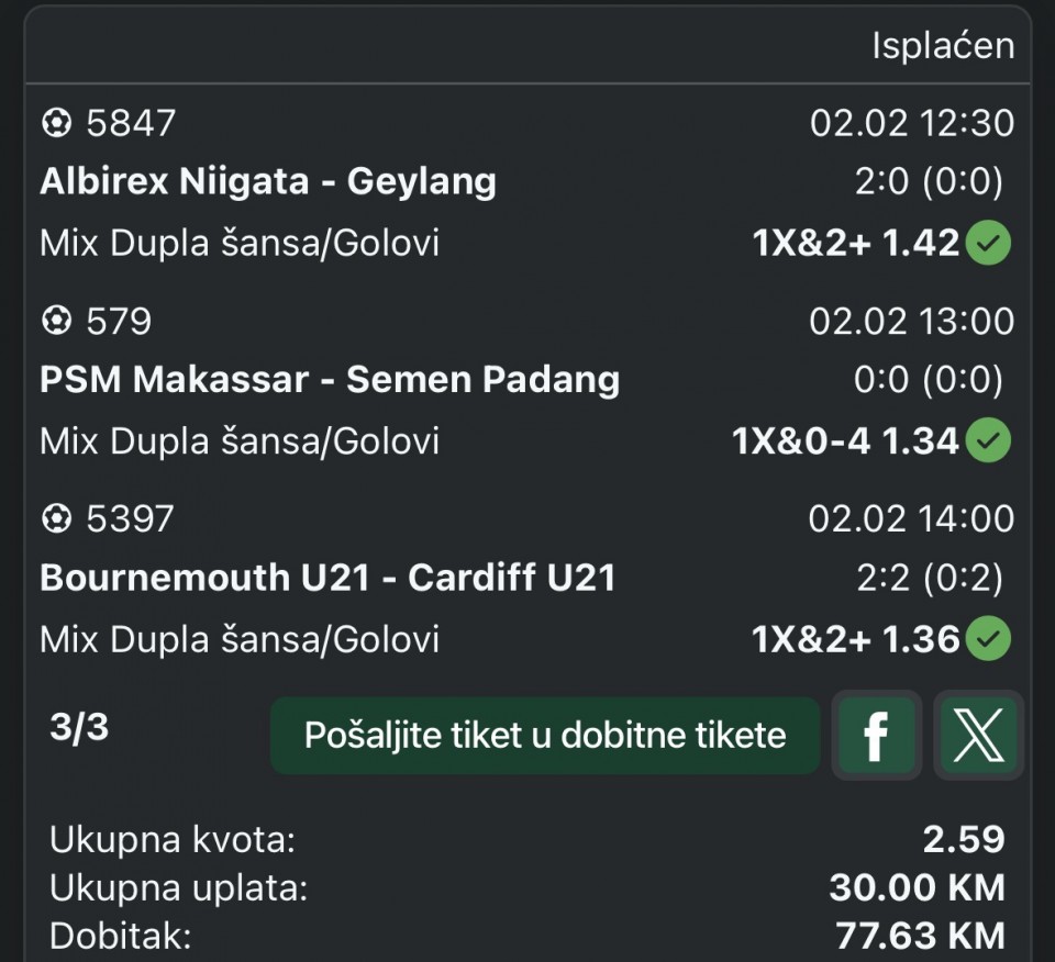 Mišljenja? Velika mi nešto kvota na Fener obzirom da jure Galatu koja im je pobegla na +6, pa su pod moranjem da dobiju. Takođe, poslednje kolo remi kući 1:1 sa Goztepe + dobar međusobni skor protiv Kocaelija...Kocaelispor : Fenerbahče 2, p/k2, t22+