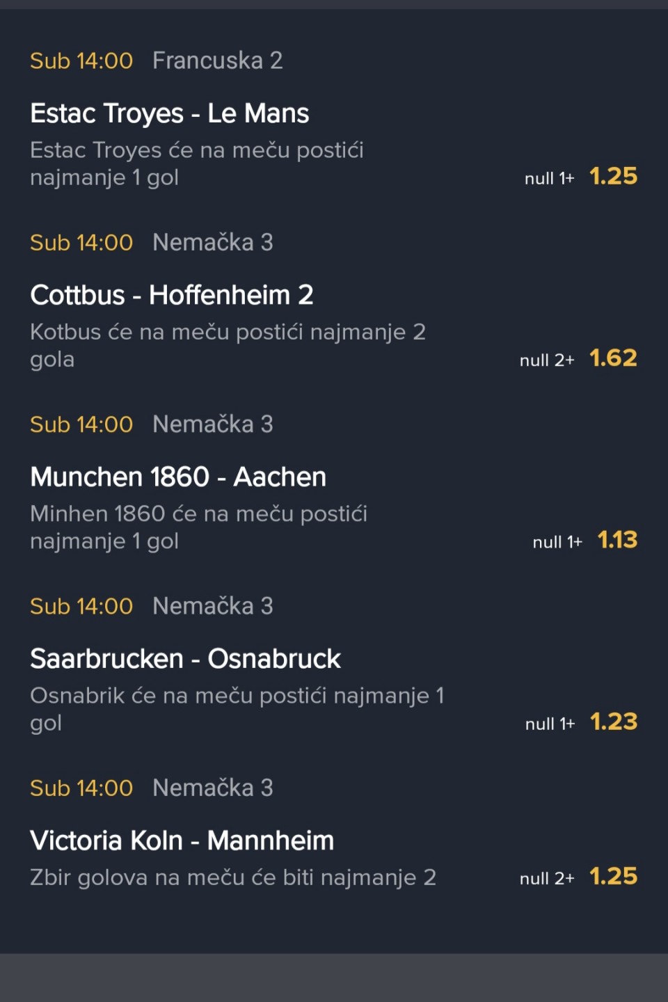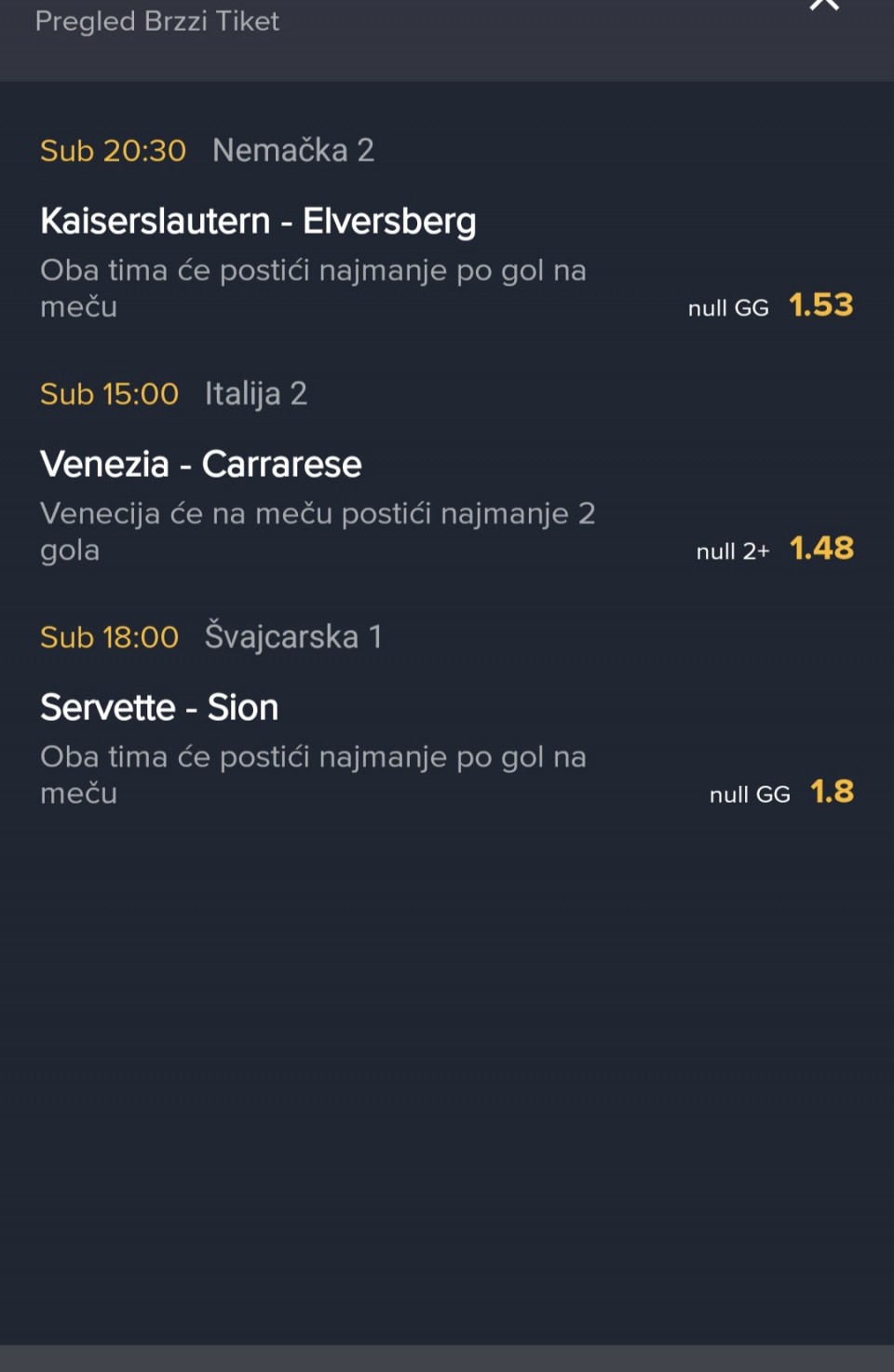 Evo od mene moja tri tiketa za danas pa vi kombinujte, po meni Laipcig tm1 2+ kaizeslautern GG Troja tm1 1+ su medju sigurnijim, Servet gg mislid da bi lagano trebao jaca kvota i Venezia tm1 2+ isto jaca kvota bez razloga