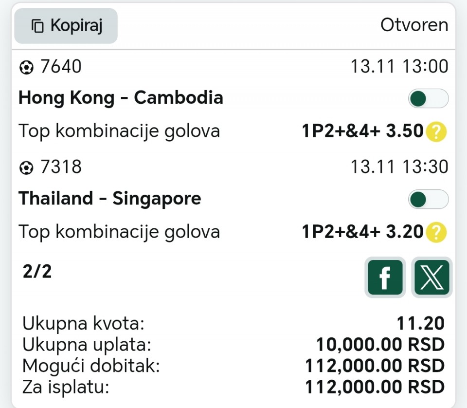 Pozdrav svima. Evo od mene danas jedan double koeficijent 2.17 Fritz 1 i Thailand 3 i više golova. Sretno svima
