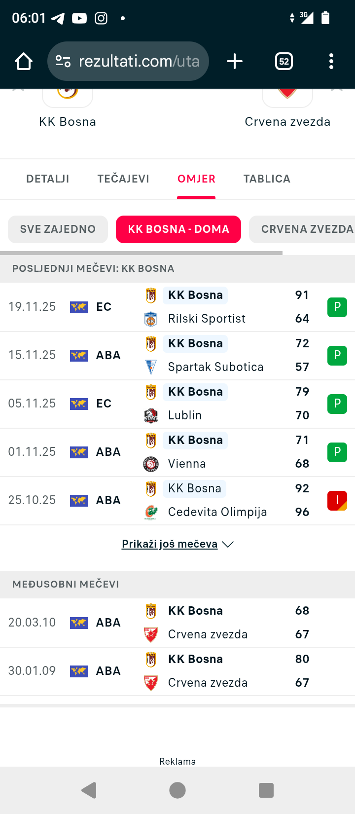 Duel koji me je dosta namucio ??? Domacin ponovo Sarajevo, c.zvezda koji tim izvodi 23 ili 46 ti, ovdje moze biti ozbiljna prica , KK Bosna po iznenadzenje mnogih uopste lose ne izgleda u ABA Ligi i cini se da su neki igraci uhvatili ritam ,...Duel koji me je dosta namucio ??? Domacin ponovo Sarajevo, c.zvezda koji tim izvodi 23 ili 46 ti, ovdje moze biti ozbiljna prica , KK Bosna po iznenadzenje mnogih uopste lose ne izgleda u ABA Ligi i cini se da su neki igraci uhvatili ritam , nedavno su porazili Spansku Murciu i Spartak Suboticu u istoj dvorani , extremno je mala kvota na domacina , realno 12 kvota je bila ok, medzutim da li se nesto zna vec ??? Prijedloge pisite u komentare ,