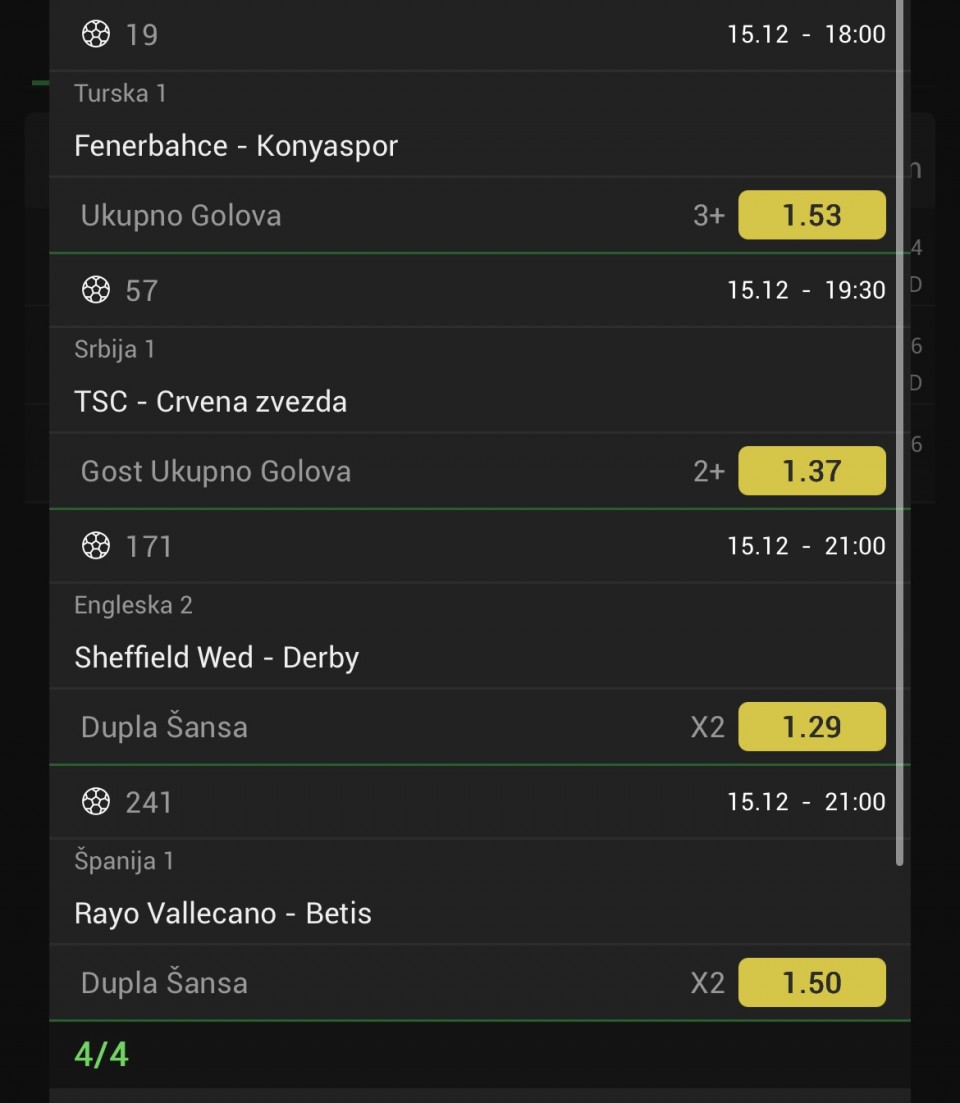 Vidim da dosta ljudi danas uplaćuje na Fener. Obično takve situacije znaju krenuti u kontra smjeru, pa možda vrijedi razmisliti o singlu - da gost postigne gol u prvom poluvremenu (3.40) ili barem na cijelom meču (1.80).