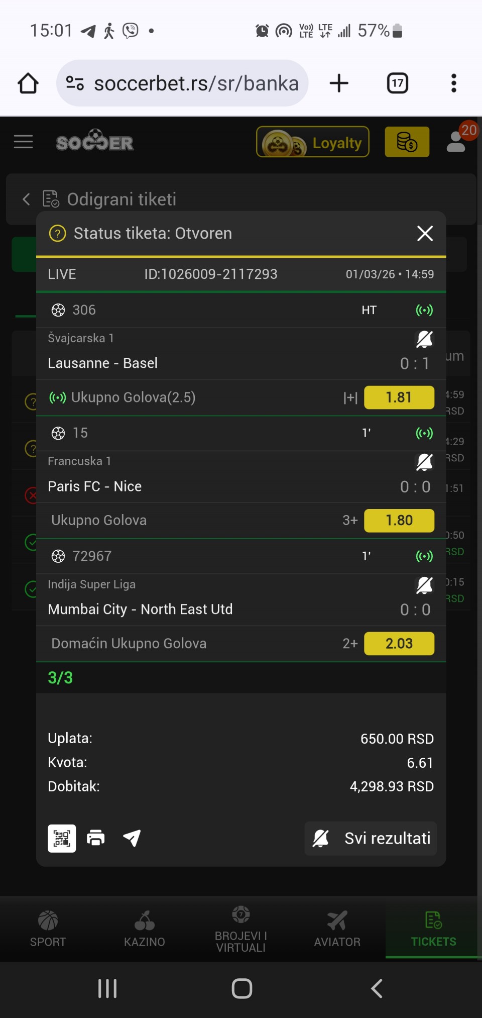 zbroj golova Hafner Kai (4.5) over koef 1,31