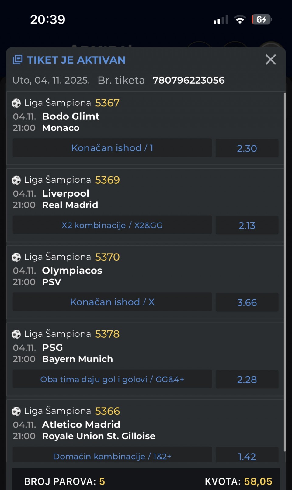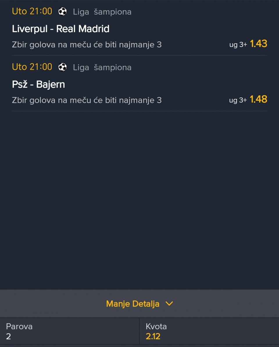 Liverpool v Real Madrid ukupno kartona 4.5 vise