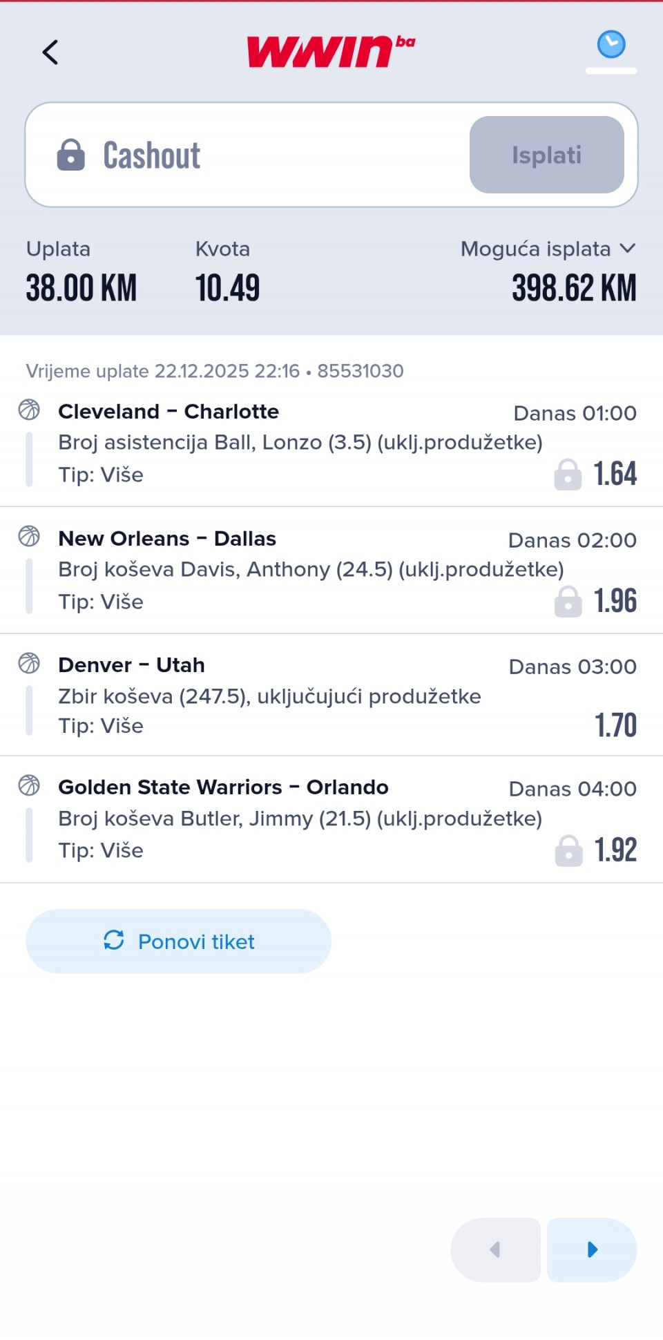 Cekam da samo izadje ovo dostupno na...Stize nesto malo sto se tice NBA-a za veceras, mala grupa predloga ali odabrana, imam njih 10ak koje sam izdvojio za veceras ali su po meni ova 4 najsigurnija ubedljivo za veceras.