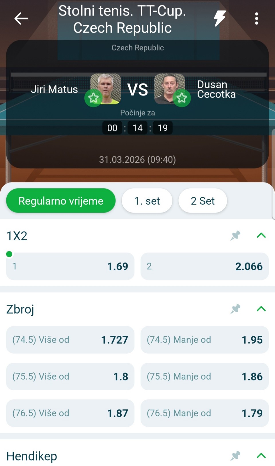 Kvota za prvi set je 15. Kvote su sa bet365.
