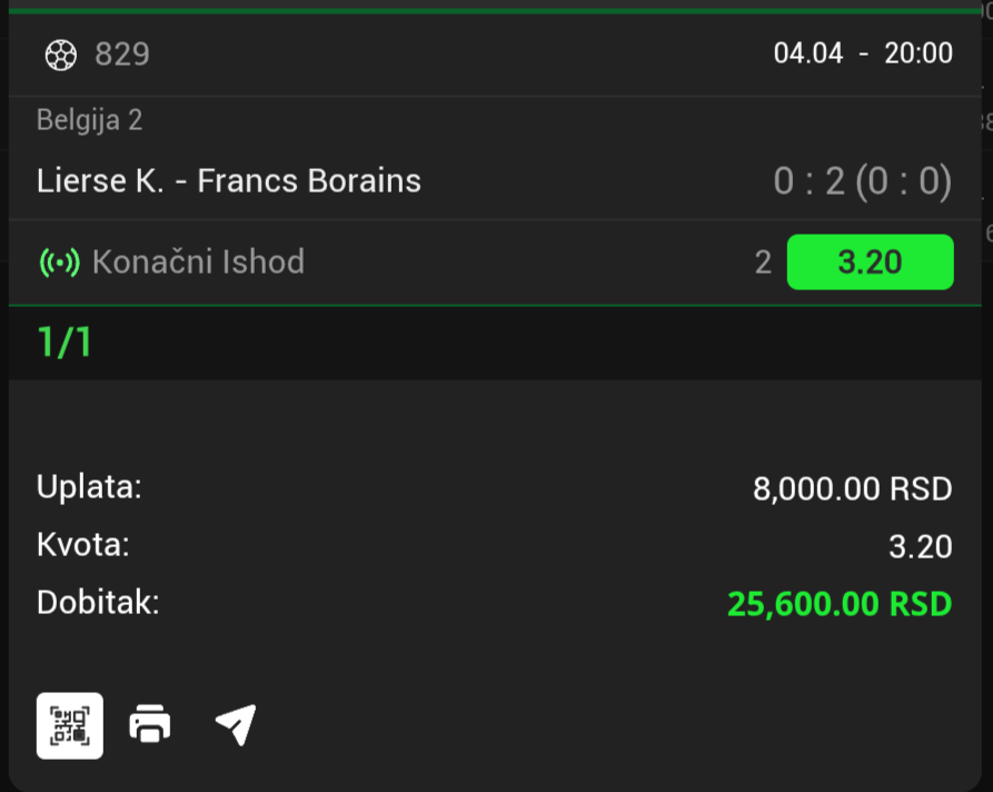 Za večeras sam iskombinovao ovo, vidite ulog i kvotu. Nisam se mnogo zalijetao jer su mi večeras nekako sve tekme škakljive. Postavit ću i drugi rizičniji tiket u komentaru koji se sastoji većinom od igrača koji izlaze iz povreda i traže formu...Za večeras sam iskombinovao ovo, vidite ulog i kvotu. Nisam se mnogo zalijetao jer su mi večeras nekako sve tekme škakljive. Postavit ću i drugi rizičniji tiket u komentaru koji se sastoji većinom od igrača koji izlaze iz povreda i traže formu.