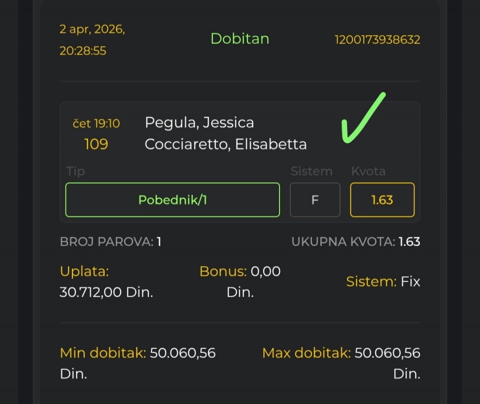 Danas je baš favorit i možda vredi iskoristiti ovih 1,25 koliko se plaća njegova pobeda i spojiti sa još nečim. Ipak, ja igram over, jer kao nosilac ove godine ima 5/6 overa u prve tri runde i prethodne godine je bio na visokom procentu što se toga tiče. Hiđikata ništa specijalno, no ajde da vidimo kako će Tiafo odigrati svoj prvi meč na šljaci. Taj meč nikada nije lak.