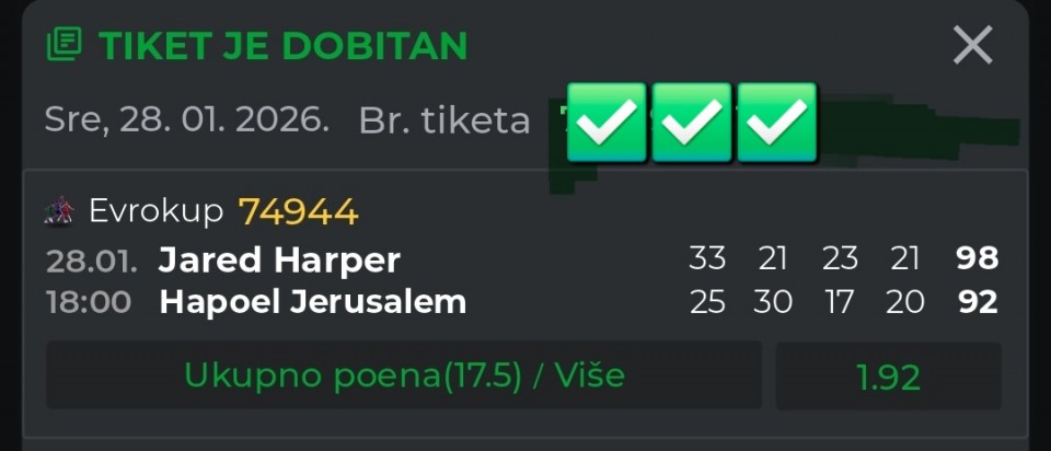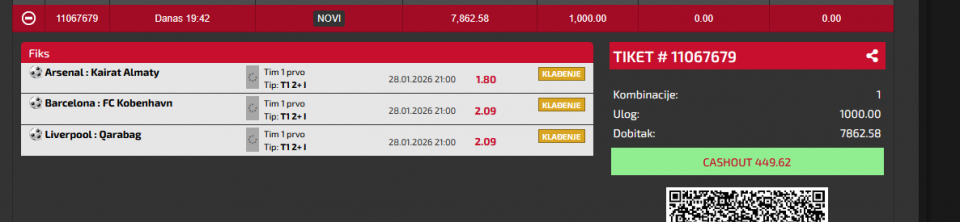 Ajax x2 2+, Arsenal 3 do 5,A Bilbao tim2+, Atletiko Madrid 2 do 5, Barselona GG, Bajer Leverkuzen 1, Dortmund tim 1 1+ DP, Klub Briz x2 i 2+ , Totenhem 2, Liverpool 2do 4,2 do 5, Man Siti gg3+, Monako x2, Celsi x2tim2 2+, Pafos manje od 3,5, Psg...Ajax x2 2+, Arsenal 3 do 5,A Bilbao tim2+, Atletiko Madrid 2 do 5, Barselona GG, Bajer Leverkuzen 1, Dortmund tim 1 1+ DP, Klub Briz x2 i 2+ , Totenhem 2, Liverpool 2do 4,2 do 5, Man Siti gg3+, Monako x2, Celsi x2tim2 2+, Pafos manje od 3,5, Psg tim1 2+ , 4+ ceo mec , Atalanta 3 do 6. Odigrano sve ovo kao tiket jedan cisto da se isprati. Srecno.. Show more