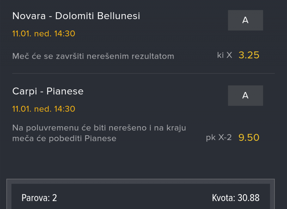 Evo jos jedan za 14:30, Novara ima boga oca neresenih, a drugi par bukvalno moze da dodje bilo sta, svidela mi se kvota pa sam zato odigrao 😁 ove parove sam i singlao pored ovoga, naravno sve tri kombinacije na sitno, cisto da se prati 🍀
