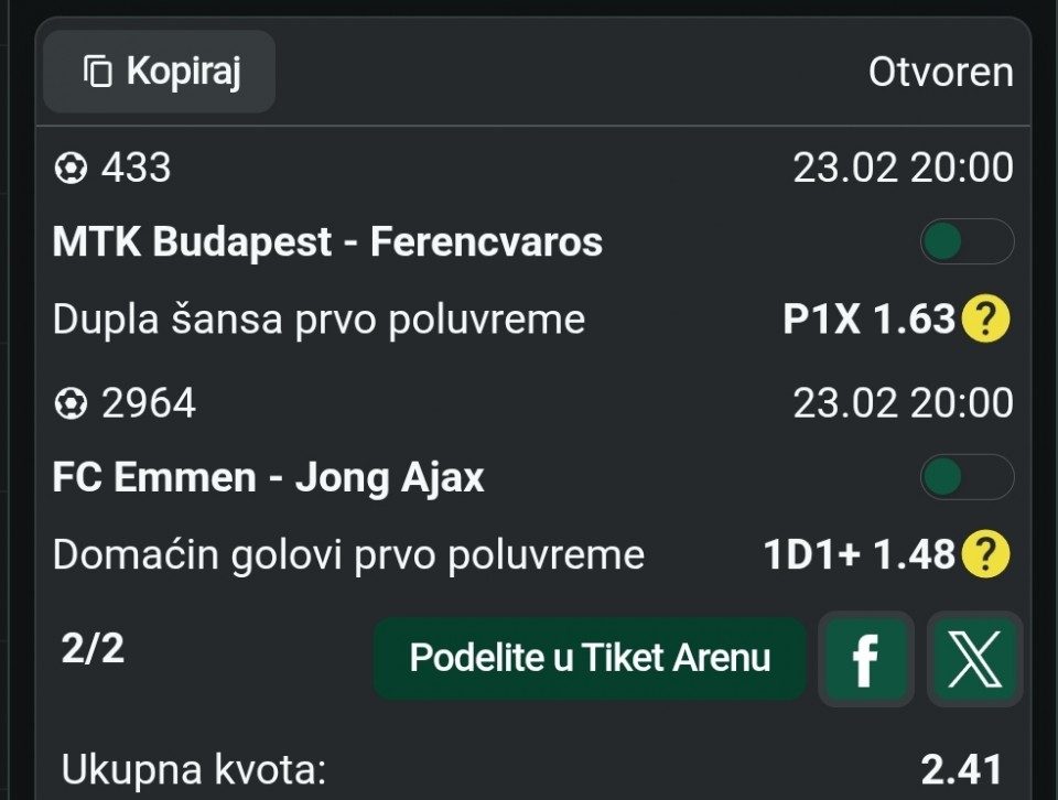 Tim 2 7+ kornera (1.50) ; 8+ kornera (2.15)