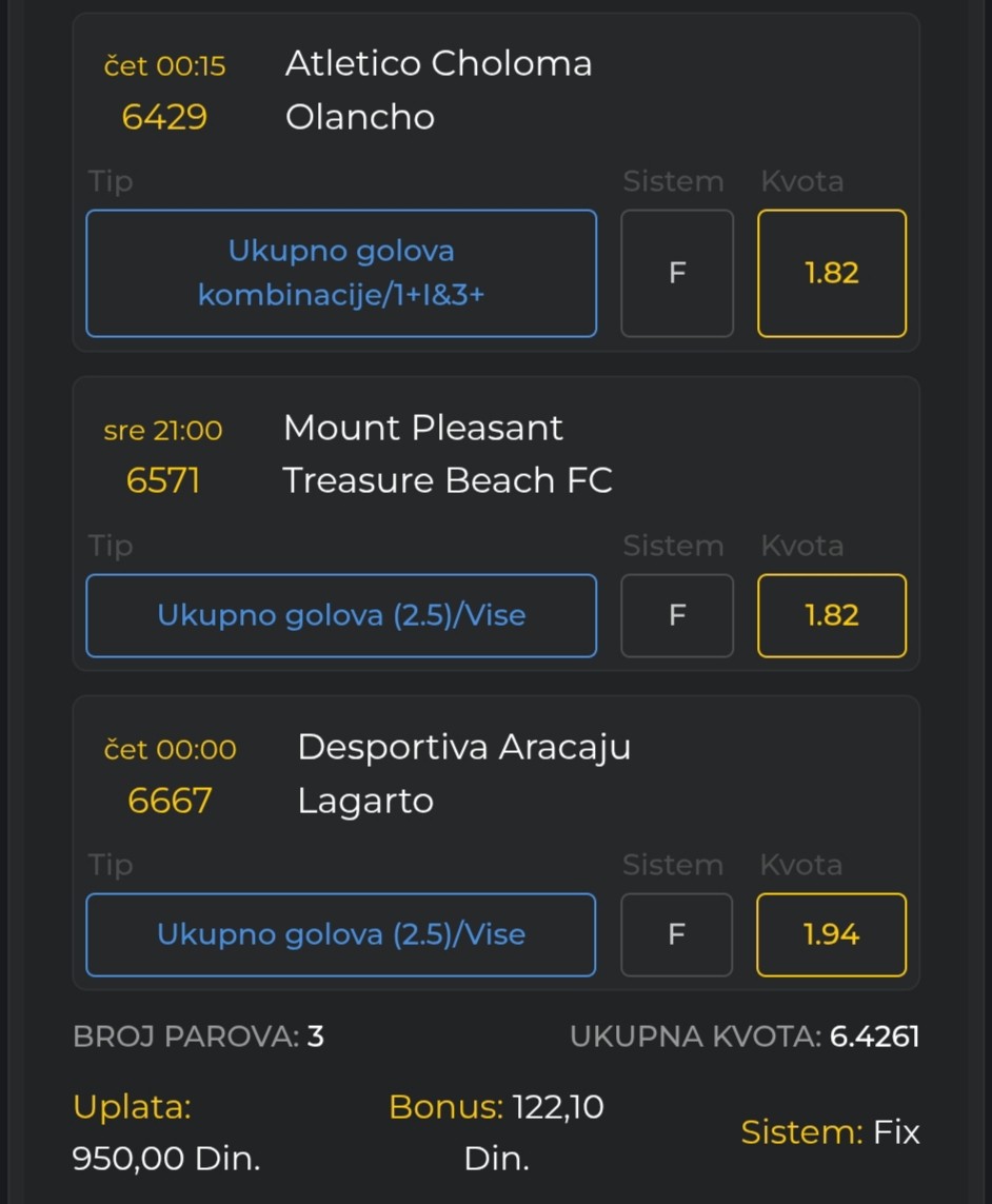 Pozdrav.Bnovale me picke na 30 dana,pa cu ti pisati odje.Imas ovu Venados yucatan - Cncun moglo bi biti dosta golova,domacini daju dosta.Moglo bi i Flamengo. - feeling happy