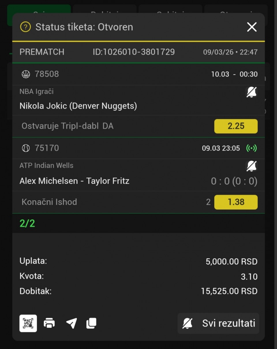 N.Jokic (DEN) - 12.5+ reb @1.85...Sinoc pad, DeRozan nije ni igrao, Zion ostao na 20 a Murray samo dvije asistencije za divno cudo..