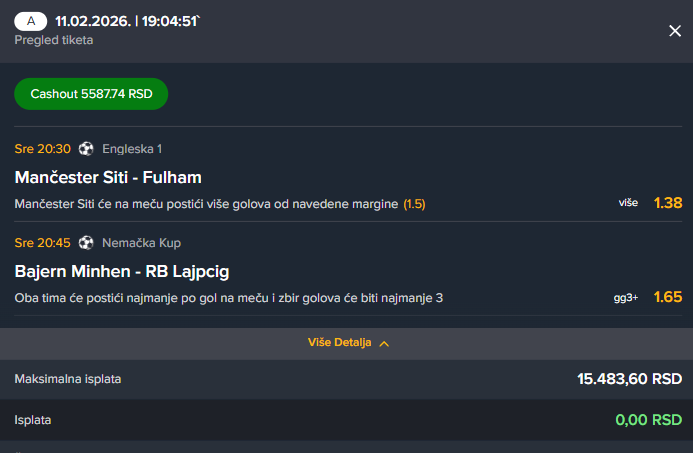 Danas ipak nista, Venezia isprasila totalno a na kraju i ovi moji nisu dobili. 🤣 Da je Venezia slucajno dobila bilo bi u poluvrijeme opet dobrog cashouta 🤣 ali ne bih uzeo danas sigurno...