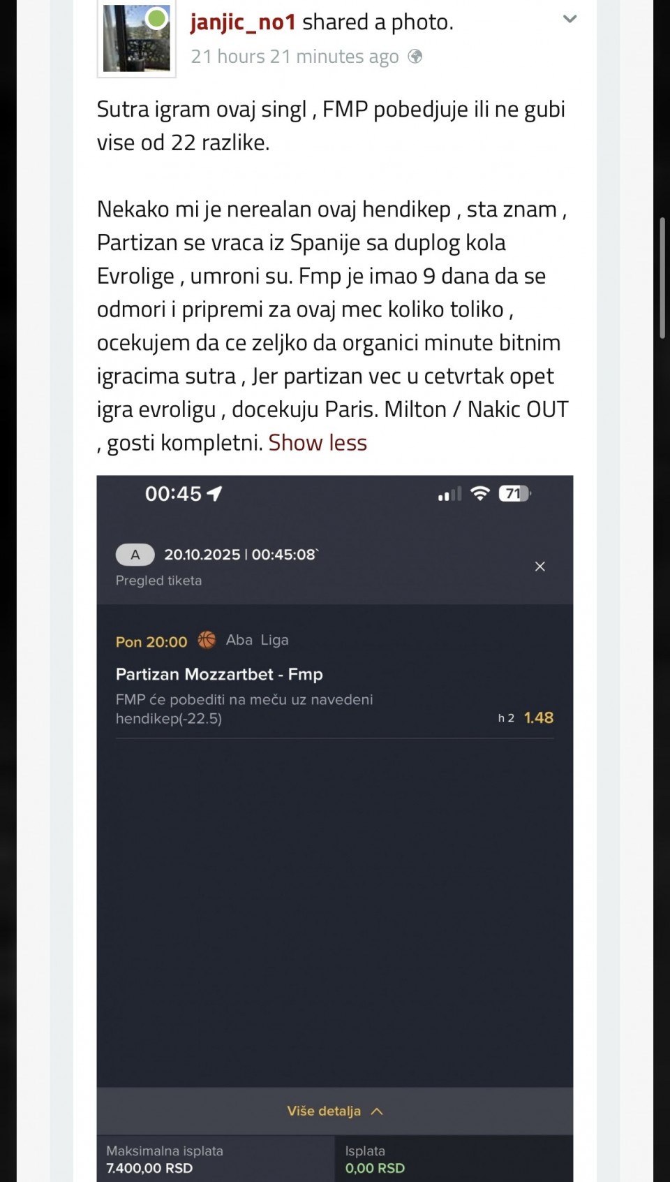 Imam problem sa bet365, uplatio sam u nedelju ujutru 1650 eur greskom, pijan, hocu da izvadim pare, rezervisao sam ali od tad samo stoji i nista se ne desava, da li moram da odigram tiket pa makar i da izgubim 50e ali da povucem ostalo ili mogu sve...Imam problem sa bet365, uplatio sam u nedelju ujutru 1650 eur greskom, pijan, hocu da izvadim pare, rezervisao sam ali od tad samo stoji i nista se ne desava, da li moram da odigram tiket pa makar i da izgubim 50e ali da povucem ostalo ili mogu sve sto sam uplatio? Hvala Show more
