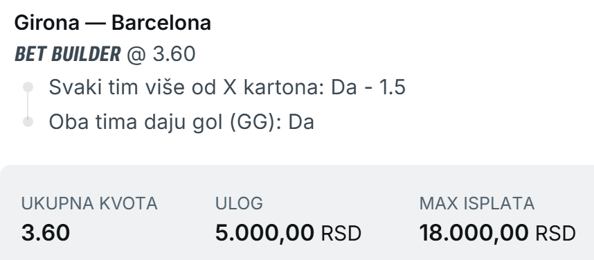 Da se ova utakmica igra u Barseloni verovatno ne bih igrao na kartone, ali kako se utakmica igra u Gironi gde je atmosfera daleko naelektrisanija nego na Kamp Nou + više kartona pada na utakmicama Girone na svom terenu i dodatno na utakmicama Barselone kada gostuje. Elem, ono što je bitnije su kartoni za timove - Gironi se pokazuje 2+ kartona na 6 od poslednjih 7 utakmica na ovom terenu, kao i Barseloni na 5 od poslednjih 8 gostovanja - uopšte oba tima (Girona kao domaćin i Barselona kao gost) u proseku ove sezone u ligi imaju 2+ kartona za sebe i 2+ kartona za protivnike, da se tako izrazim. Dolazimo do sudije Soto Grado, koji ove sezone u proseku pokazuje preko 4 kartona po utakmici. Gironi će prvi put suditi ove sezone, a Barseloni je već sudio i to u derbiju protiv Reala, kada je igračima Reala pokazao 3 kartona, a igračima Barselone 4 (dupli žuti je bio jedan), tako da može da se kaže da nije loš izbor za kartone večeras. I na kraju H2H dueli - 3 od poslednja 4 duela na ovom stadionu je bilo 2+ kartona na obe strane (nedostajao je jedan Gironi da to bude 3+ kartona za obe strane). Bila je opcija i 5+ kartona, ali poslednji duel u Barseloni kada su oba tima dobili po 2 kartona je ipak prelomio na ovu stranu...