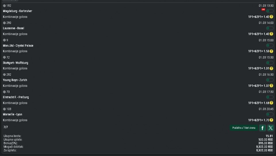 01.03.2026. 14:00h Real Sociedad B - Dep. La Coruna; tip: X; kvota: 3.15; uplata: 720,00 din.; isplata: 2.268,00 din.