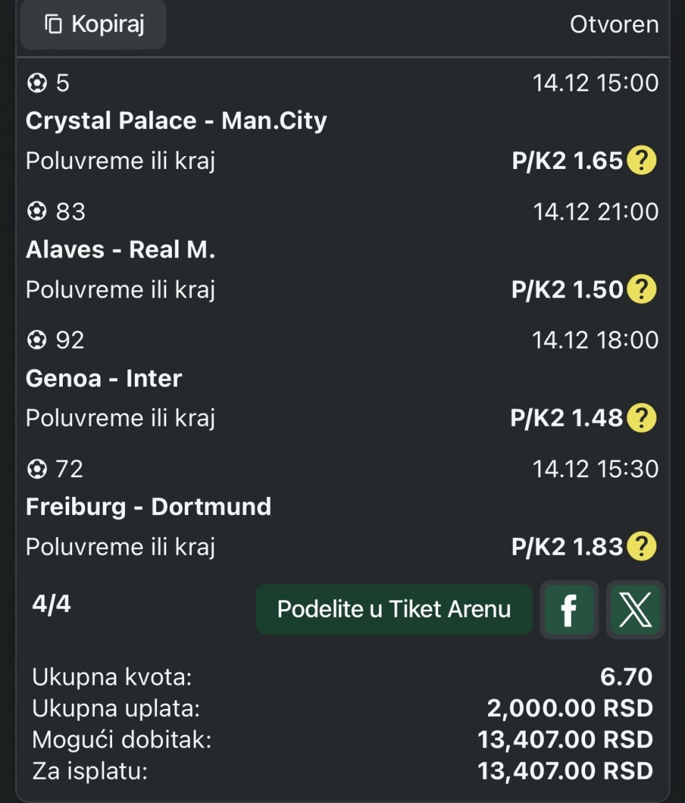 Hvala ko se slaže il isprati predlog 2,5+ na Freiburg -Dortmund 2.0 kvota čudno ali mislim da će proći