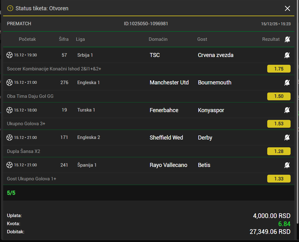 Vidim da dosta ljudi danas uplaćuje na Fener. Obično takve situacije znaju krenuti u kontra smjeru, pa možda vrijedi razmisliti o singlu - da gost postigne gol u prvom poluvremenu (3.40) ili barem na cijelom meču (1.80).