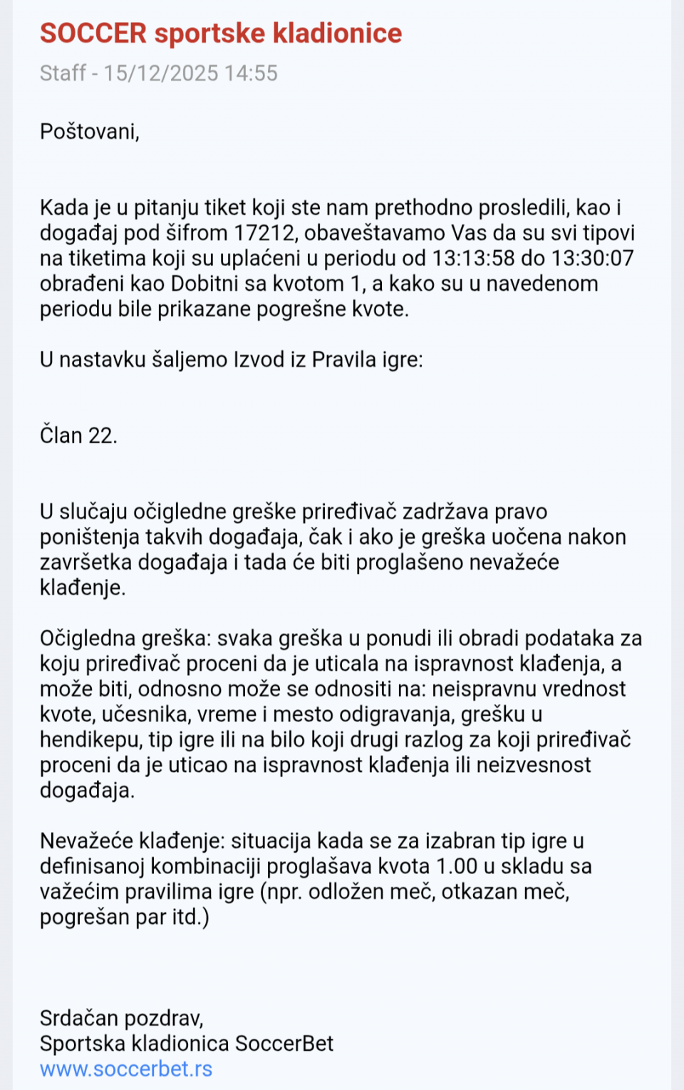 Da li je imao neko neki ovakav problem? Da li postoji neko rešenje da dobijem svoj dobitak ili je kladionica u mogućnosti da radi šta hoće iako je prošlo? Verujem da ne bi bio isti ishod da je pao tiket...