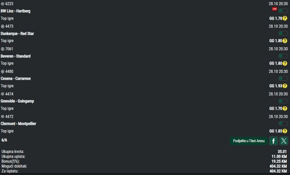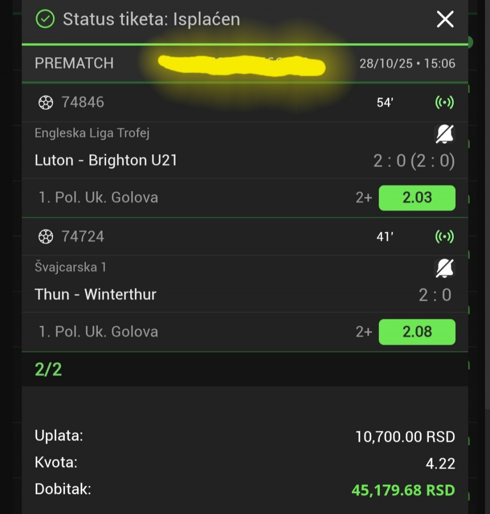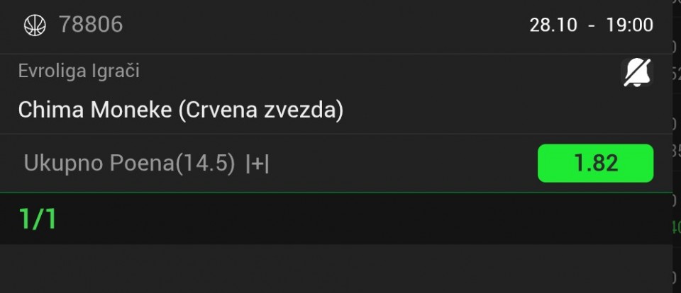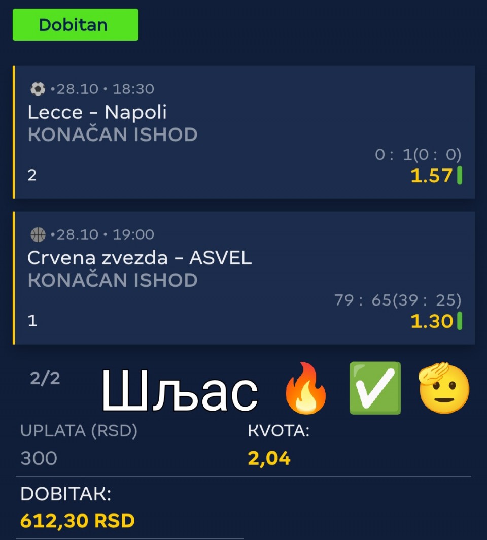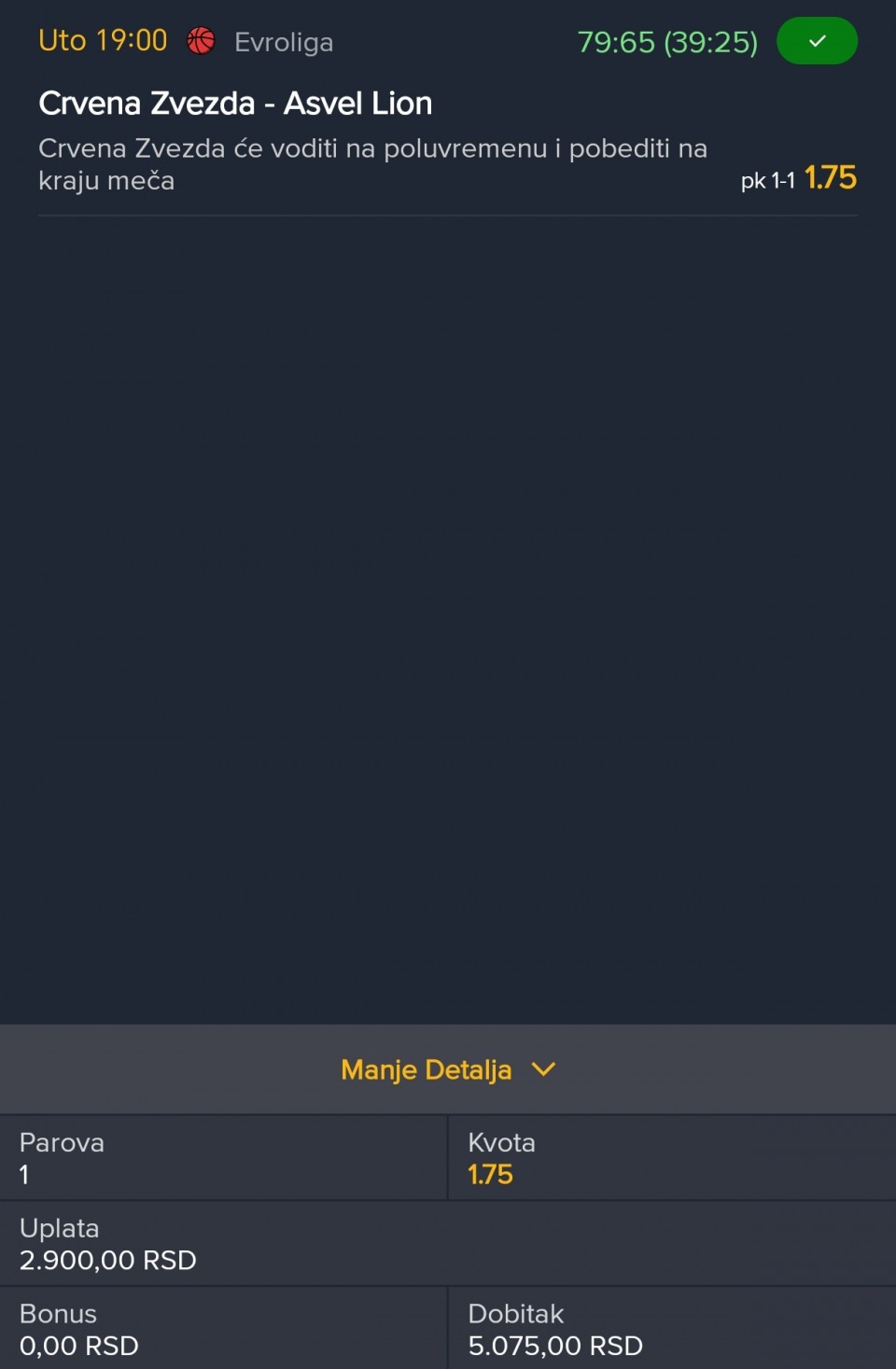 Lepo je krenulo, prvo pa muško što bi se reklo. Za noćas ostavljam još jedan par i to je dosta za današnji dan. Kao što sam i rekao ne jurim ništa, cilj mi je da što više mojih...20:00🇨🇵🏀ELITE 2: La Rochelle-Roanne 🔹UPI 78,5+🔹(1.85) HT 46:35✅