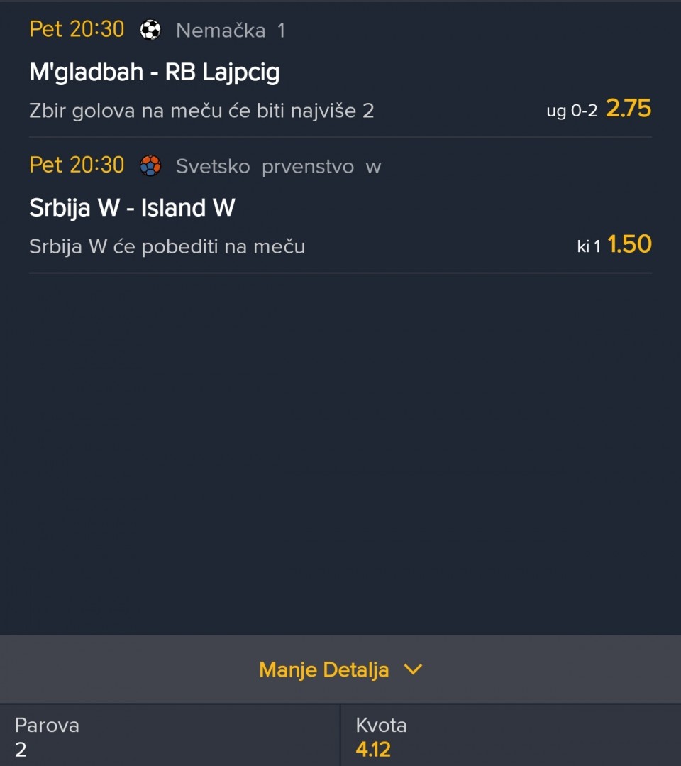 28.11.2025. 20:30h B. Monchengladbach - RB Leipzig; tip: X; kvota: 4.00; uplata: 180,00 din.; isplata: 720,00 din.