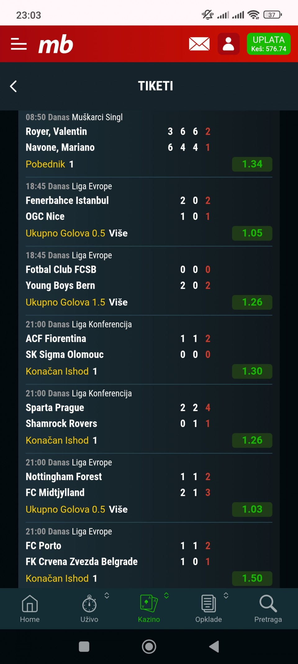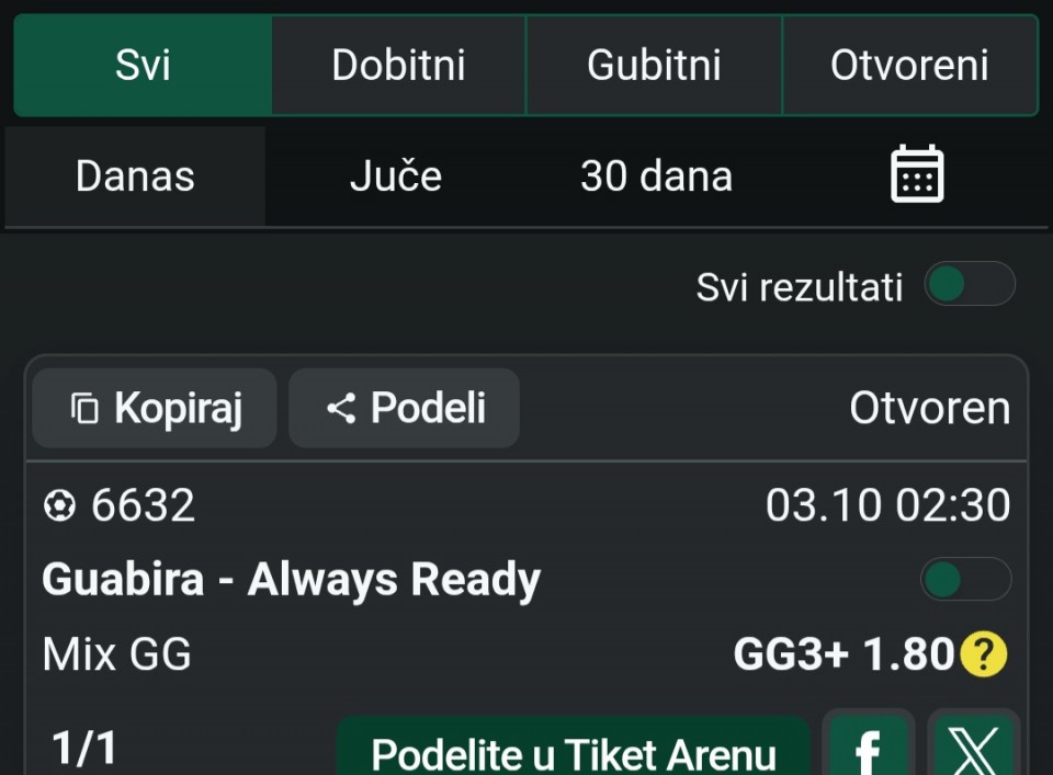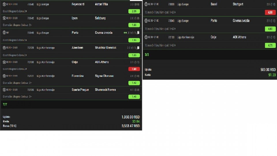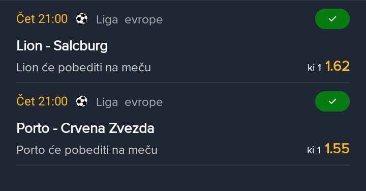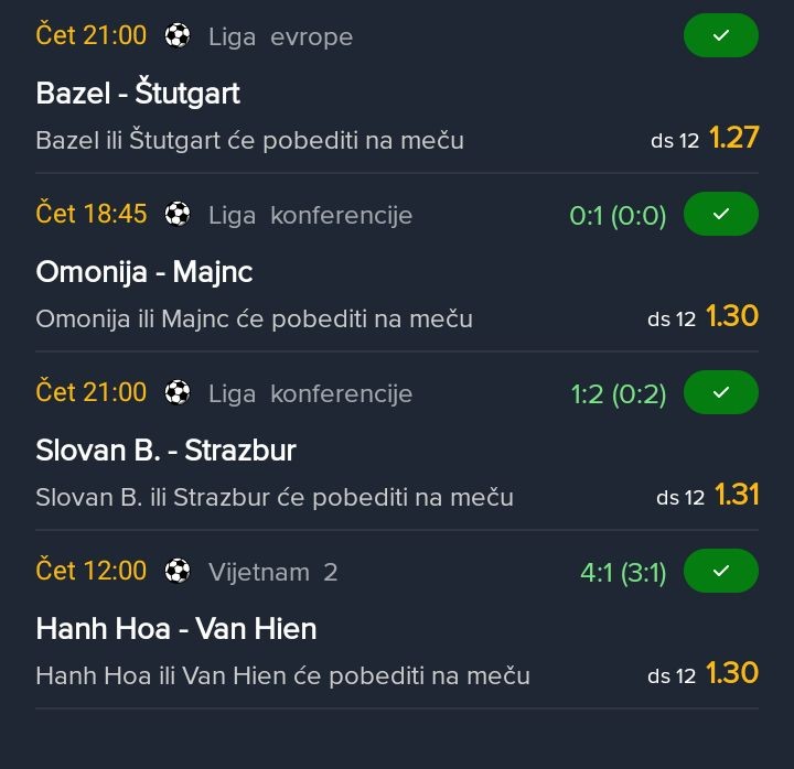 Jeste da sam malo kasno objavio, tenis je već završio bio, ali ostatak se moglo odigrati, bilo je i malih kvota i svega. Ali bitno je da se zeleni. Idemo dalje