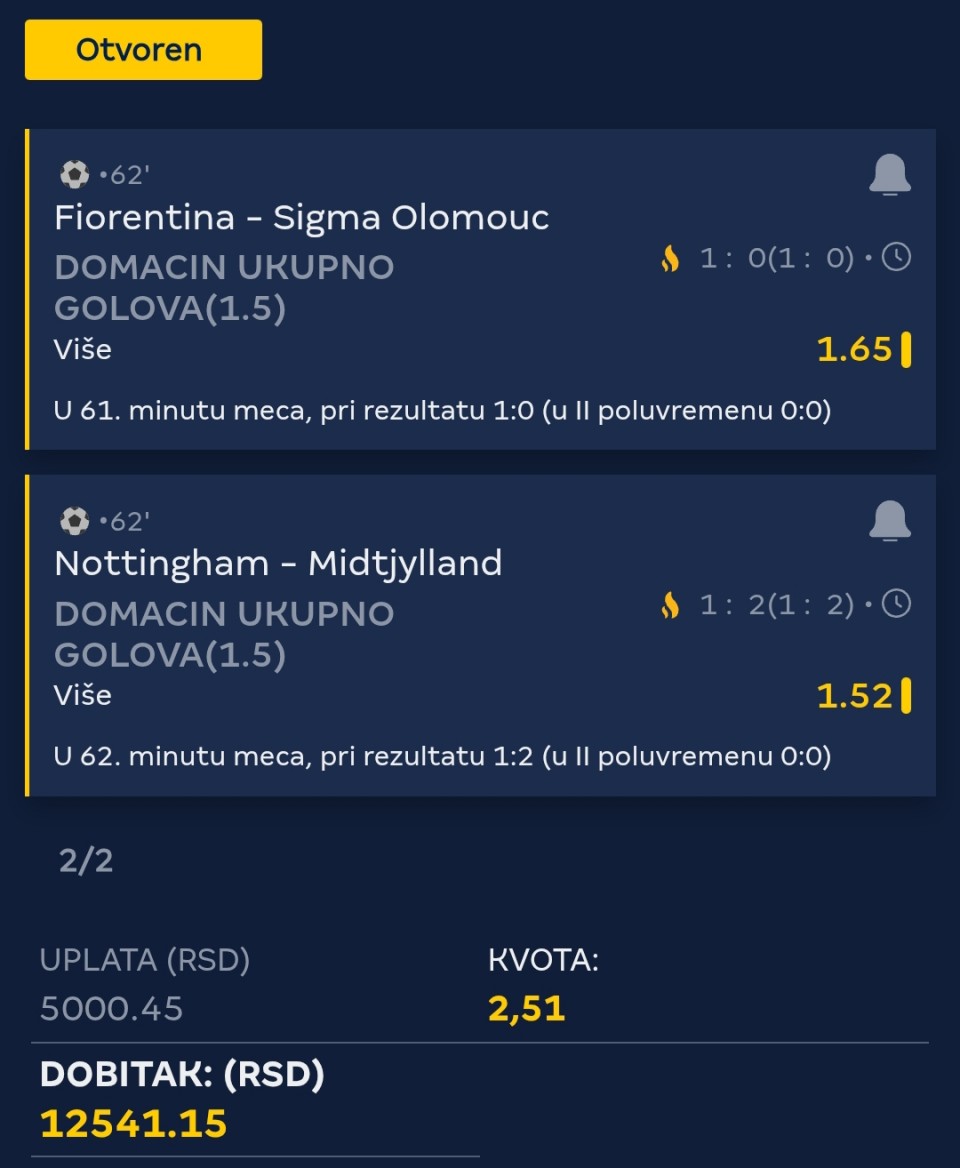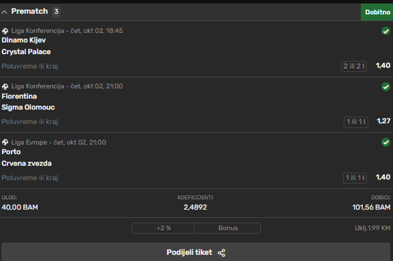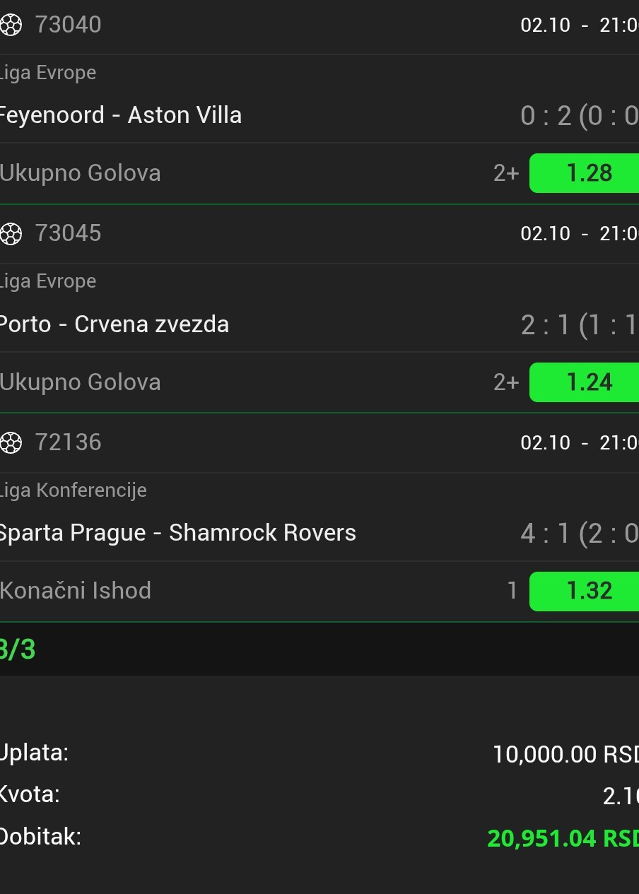 (02.10.) 𝚆𝚒𝚗 2.38 ☞ 2...mnogo volim kad duplam ulog pa im skinem ove kvote na jači ulog 🤑 još (7) pogodaka pa mercedes