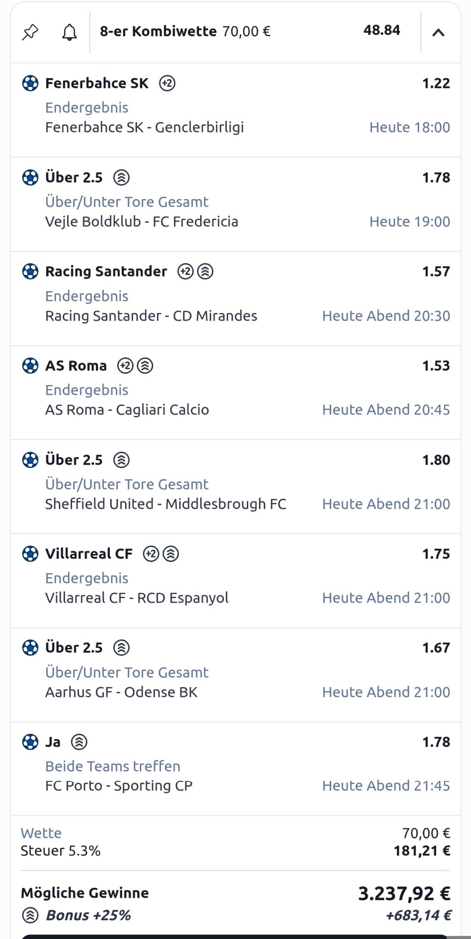 Benfika 1 i 3+, 3+ pp 7,50 kvota, Besiktas 1 i 2 do 5,1 u 1 i gg drugo , Inter 2 i gg, 2 i gg prvo, Psg gg3+ , Atletiko Madrid 1 i 2+, 1 u 1 i gg drugo 7,50 . Srecno.