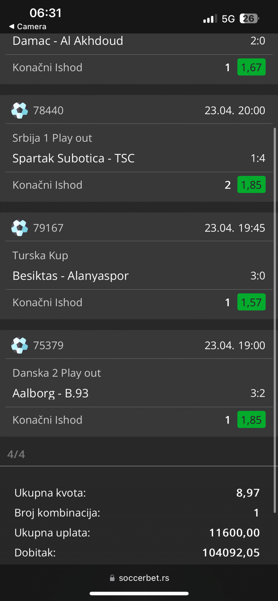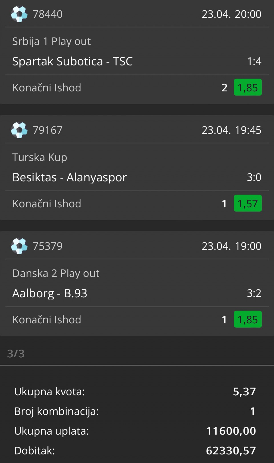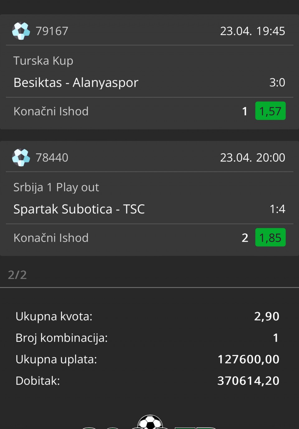 Juče sam krenuo sa ovim sistemom klađenja, tiketi su 2/2, lep profit sam ostvario.