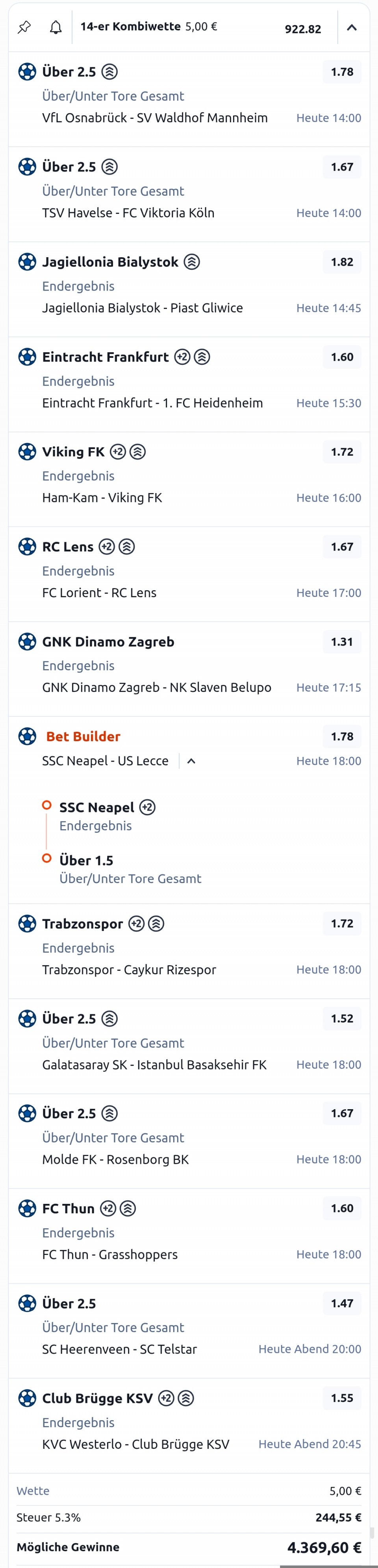 9 | 15:30 | Eintracht Frankfurt - Heidenheim | 1X i 2+ | 1.36