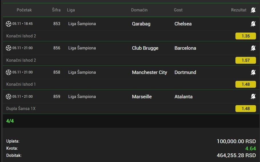21:00 Manchester City-BorussiaD 4+ 2,20 ILI 5+ 3,60