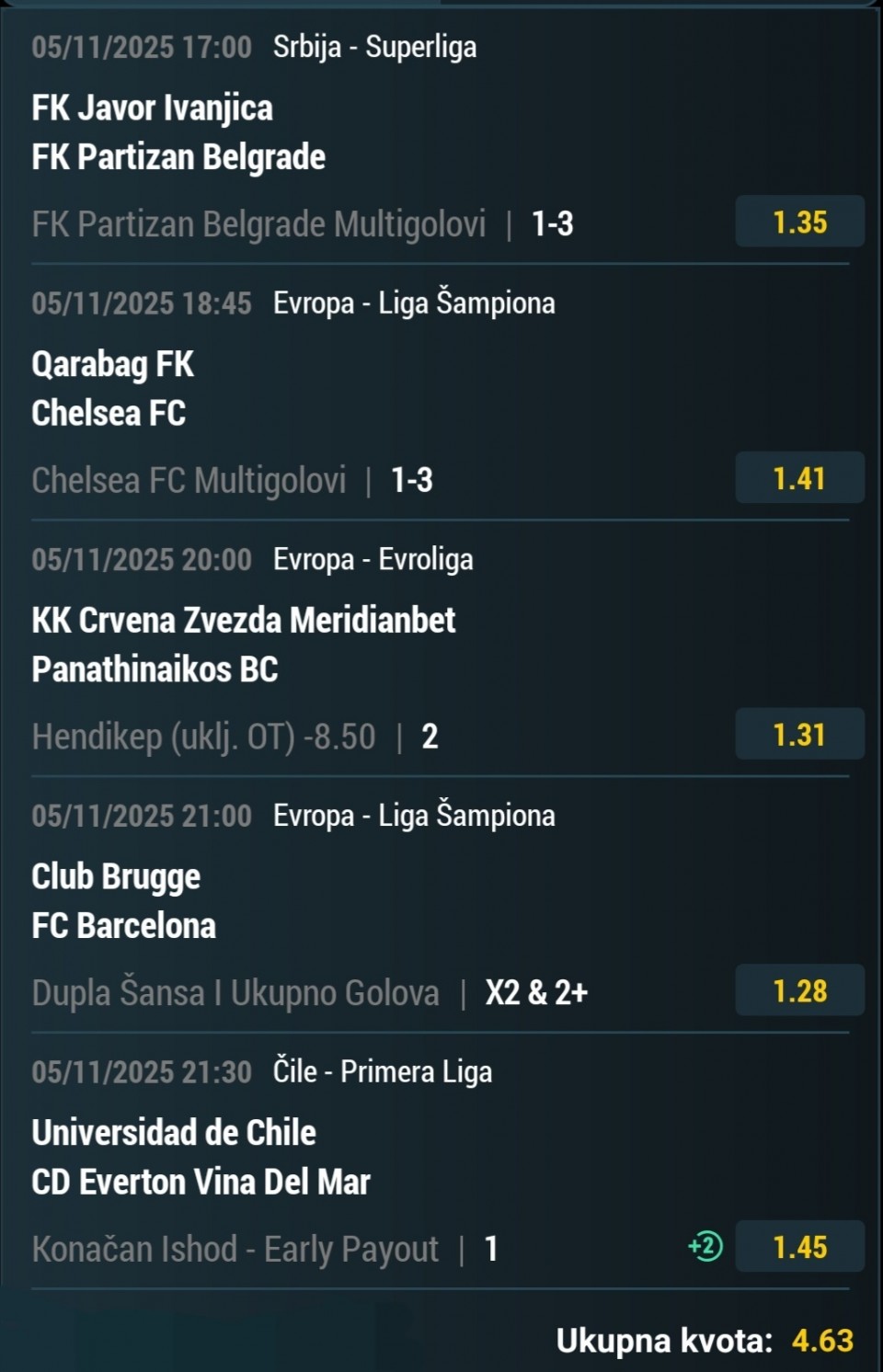 21:00 Club Brugge-Barcelona H1:0 2 2,50⚽️DANAŠNJI SINGLOVI⚽️