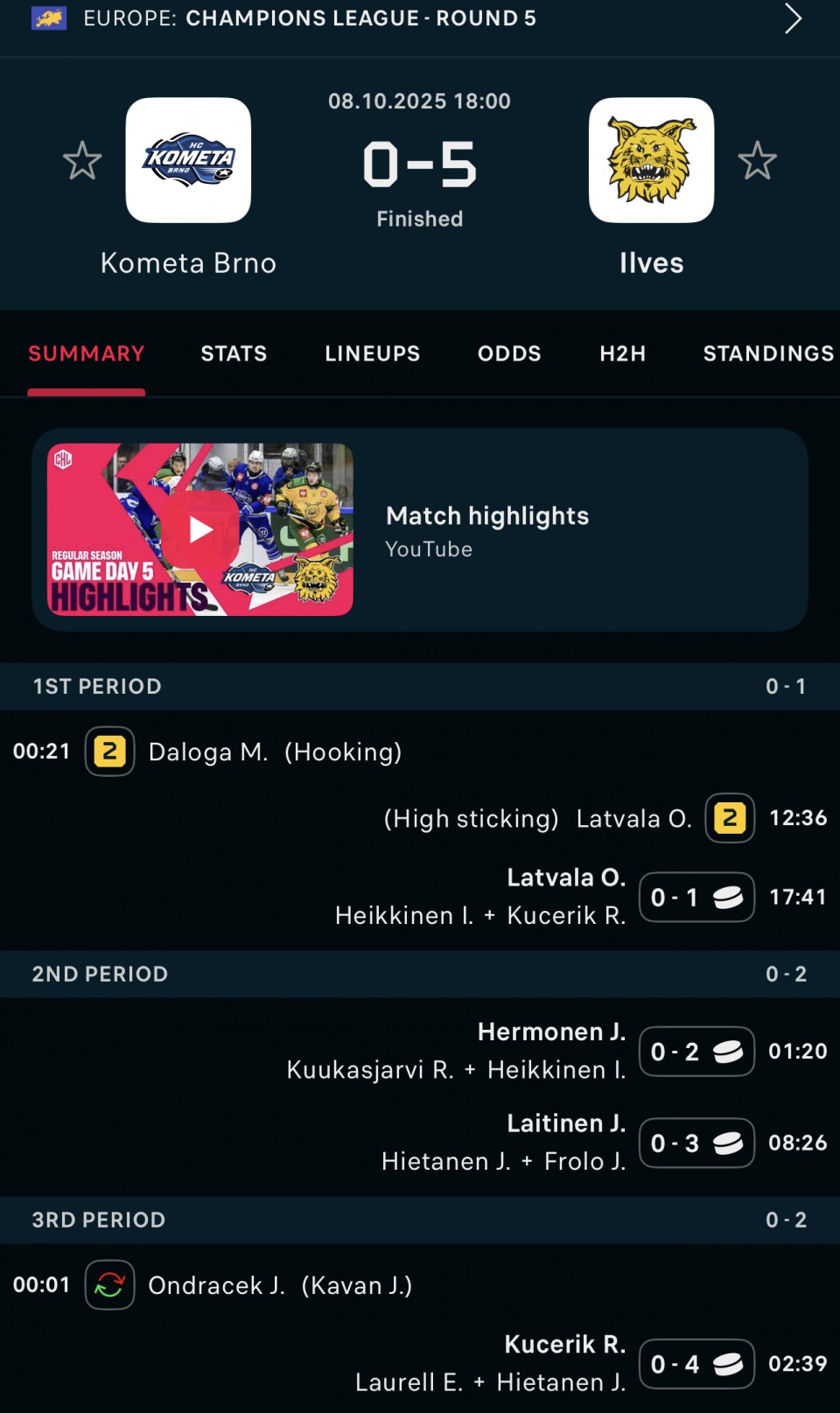 18:00 HC Kometa Brno - Ilves KI 1 - tim 1 pobjedjuje na meču (1,50) lose ❌