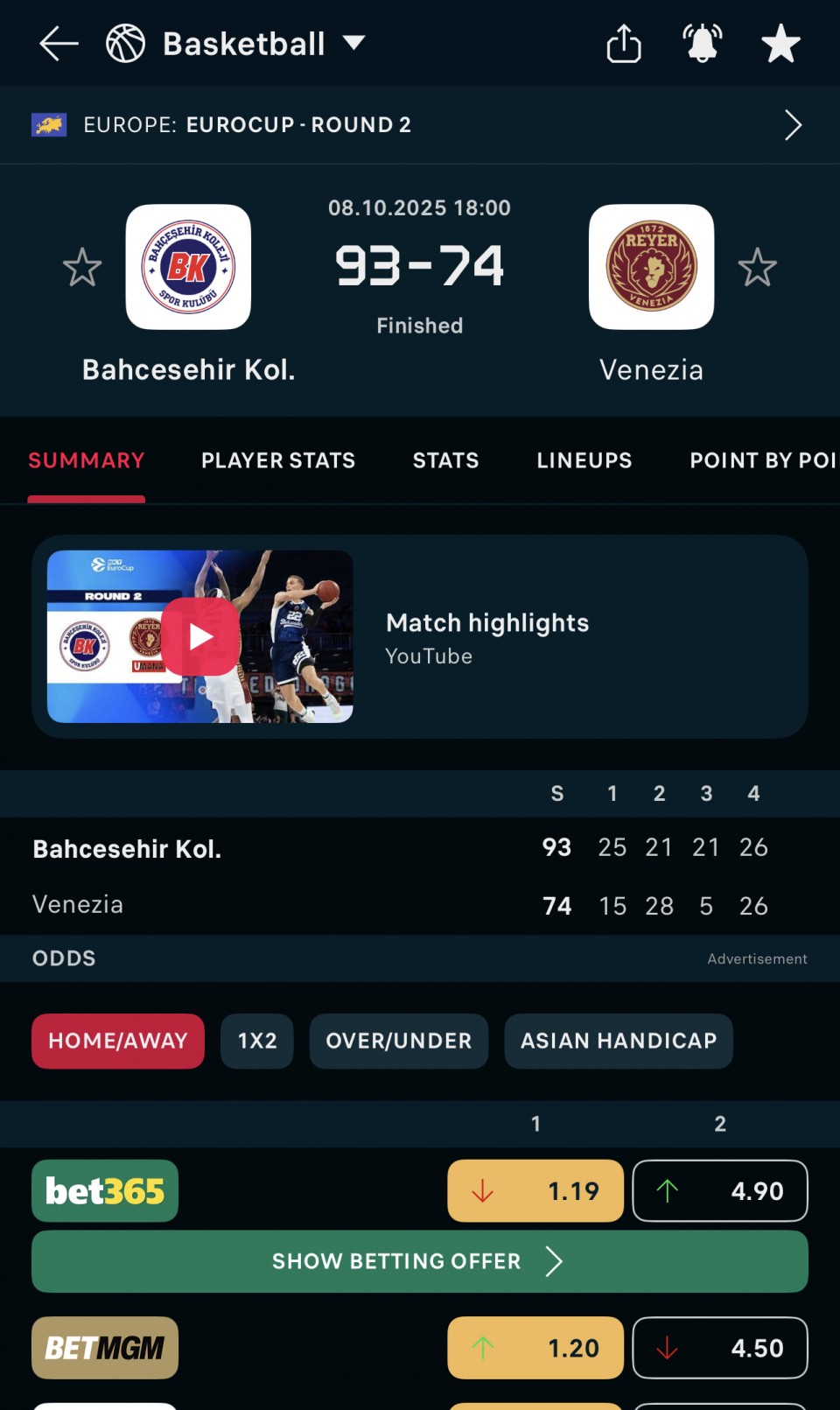 18:00 Bahcesehir Koleji - Venezia AH1 -7,5 - tim 1 pobjedjuje sa najmanje 8 razlike (1,75) WIN ✅