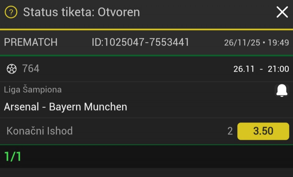Arsenal do sada bez primljenog gola u Ligi Sampiona, mislim da je veceras i te kako vreme da se to promeni. Bajern izlazi u svom najjacem sastavu i ne sumnjam da ce napadati od samog pocetka a kvota je i vise nego...Arsenal - Bayern G1+ @1.40