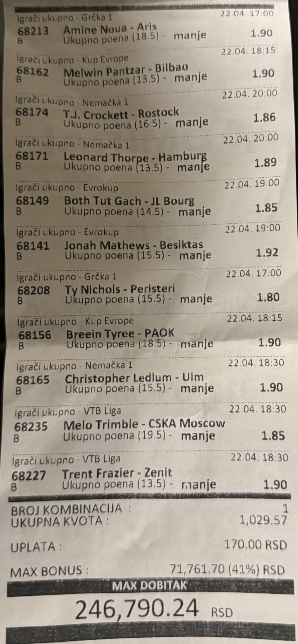 Cody 12,5 +++ ( ocekujem ga maximalno agresivnog, mozda mu bude i poslednja utakmica u Evroligi za Crvenu Zvezdu ).