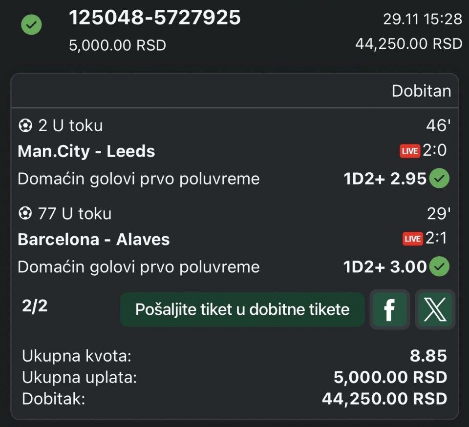 Kad god barsa igra za mene value pik, po gol u oba poluvremena i ne vise od 3, kvota sasvim pristojna, protivnik ne tako jak, Barsa bod iza Reala na tabeli i njihov visok presing bice veoma veliki problem ovde za alaves sigurno, ocekujem nesto tipa 2:0-3:0 ili 2:0-4:0 kraj meca ovde ponovo kljucna stvar bice da se sto pre alaves otvori odnosno barsa postigne pogodak.