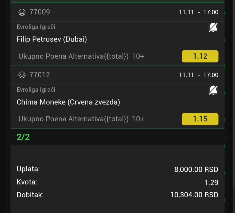Ne praktikujem ovakve tikete vec duze vreme( sitne kvote. Jace uplate). Ponuda losa a viska para na racunu. Doneli mi Slovaci zaradu u proslom postu. Pored ova dva tiketa imam i Mcknley 4.5+ asistencije. Mrsko mi da slikam tiket. Odigrano u...Ne praktikujem ovakve tikete vec duze vreme( sitne kvote. Jace uplate). Ponuda losa a viska para na racunu. Doneli mi Slovaci zaradu u proslom postu. Pored ova dva tiketa imam i Mcknley 4.5+ asistencije. Mrsko mi da slikam tiket. Odigrano u Mozzartu. Zivi tiket. Hteo u socceru a oni digli granu na 5.5 iako jos na app stoji 4.5. Srecno svima. Show more