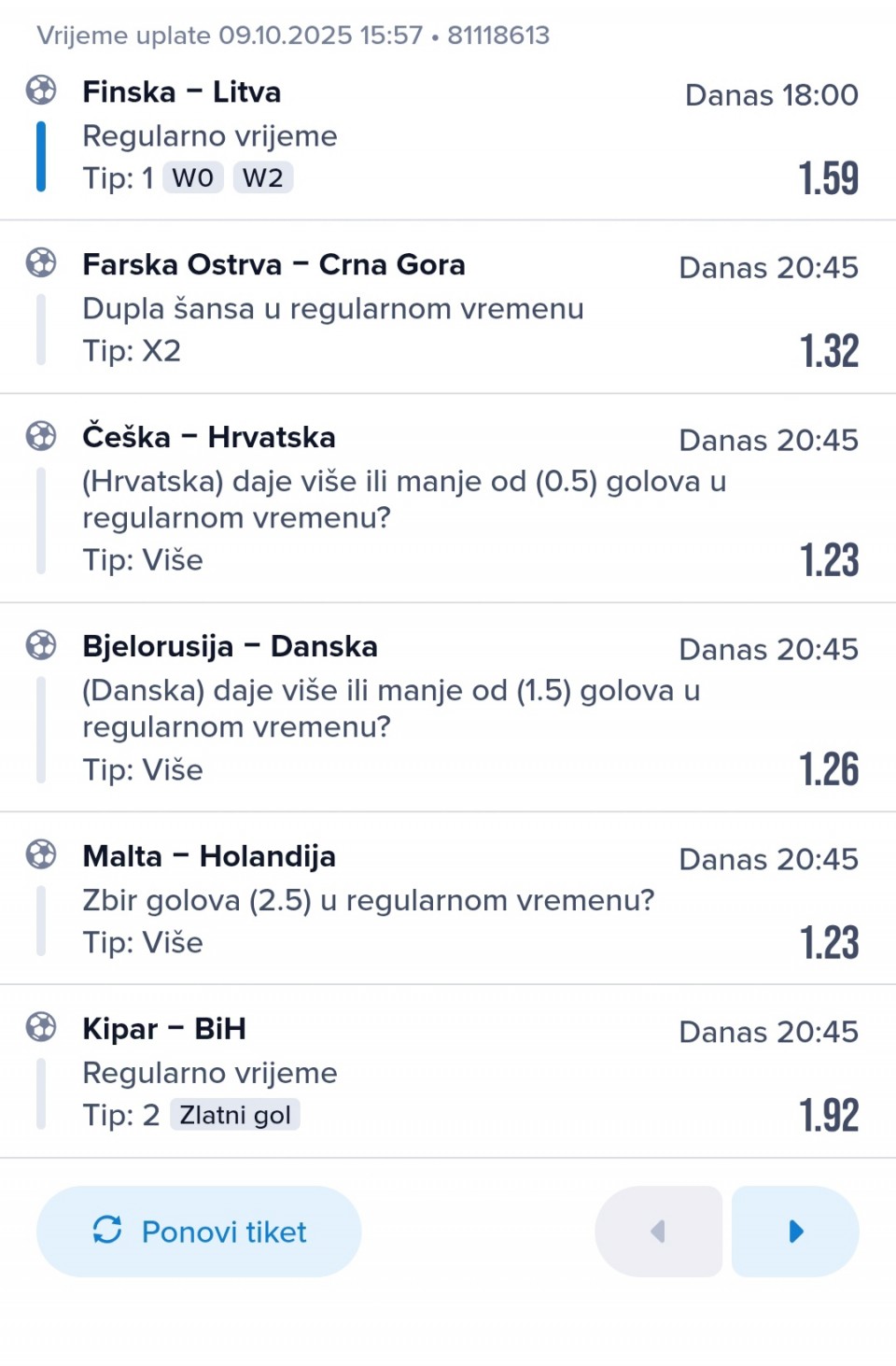 Predlog Finska 2-5 gola ,1 45 ,1×2+,1,45 , 12&2-5 gola 1 75 ,Mozambik 2+ 1,48, Bocvana 2+ 1,55. Singl, ili dubl ,kako ko hoće. Manji ulog.Sretno ko prati Maxbet