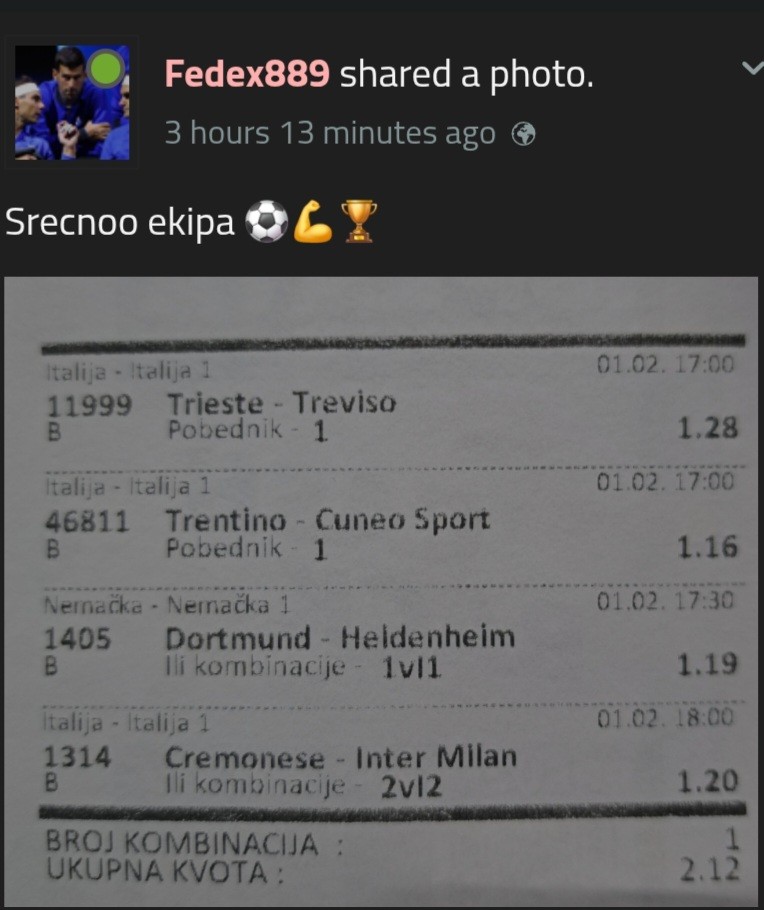 Jos jedan manje vise uspesan dan,prosao jedan tiket drugi pao zbog fejnorda koji nije mogao da postigne gol treci pao na Aston Vilu koja sa igracem vise delovala kao da ne zna gde je gol i cetvrti za sad samo na rengers, jake kvote koje sam rekao... Show more