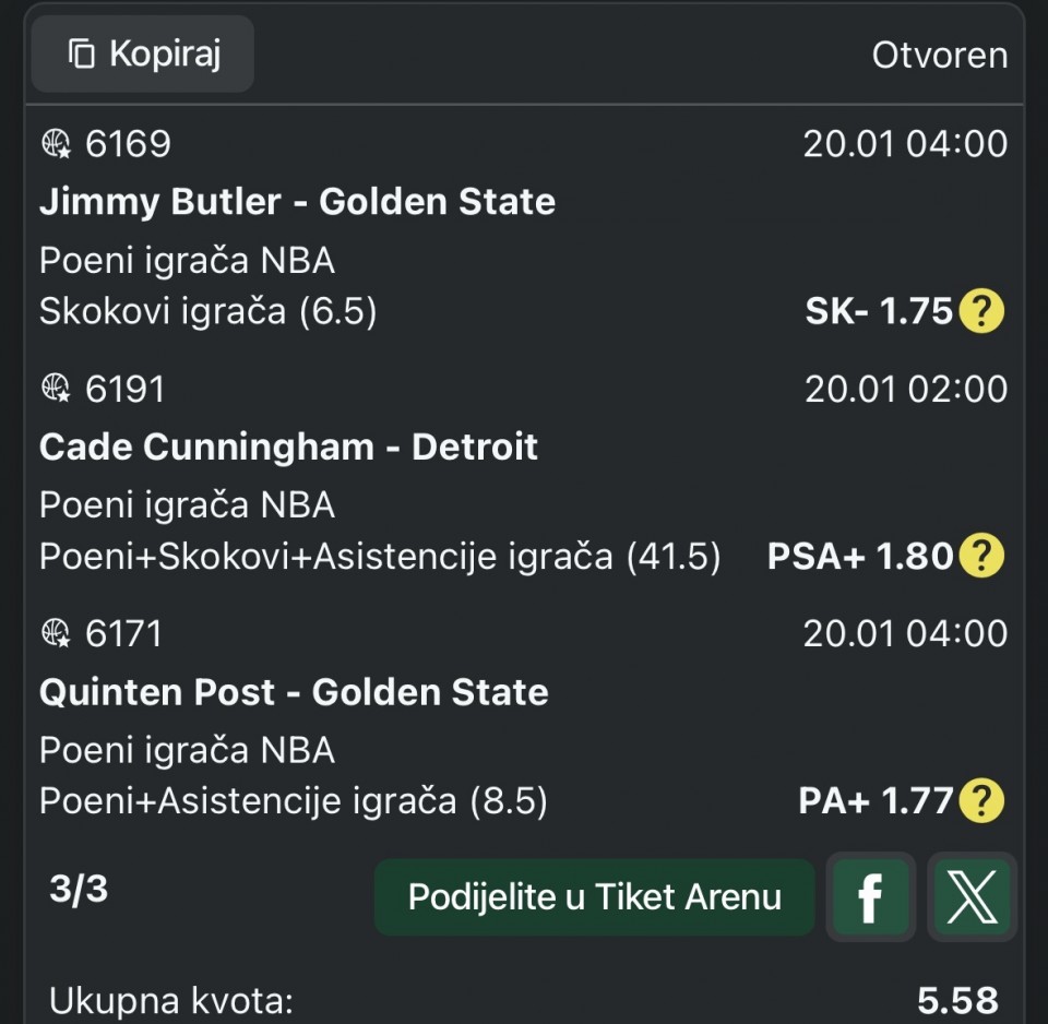 Stigao sam nesto ranije kuci, i odlucio da sa vama zelim da podelim jos moja 2 pika za veceras, s obzirom da kasnim za Mec Detroit - Boston, to ce biti na poslednjem mecu od 04:00h, mec Golden Stejta i Majamija, pa cemo ujutru odraditi kompletan...Stigao sam nesto ranije kuci, i odlucio da sa vama zelim da podelim jos moja 2 pika za veceras, s obzirom da kasnim za Mec Detroit - Boston, to ce biti na poslednjem mecu od 04:00h, mec Golden Stejta i Majamija, pa cemo ujutru odraditi kompletan rekap i prethodna 4 pika od danas i ova 2 od sada.