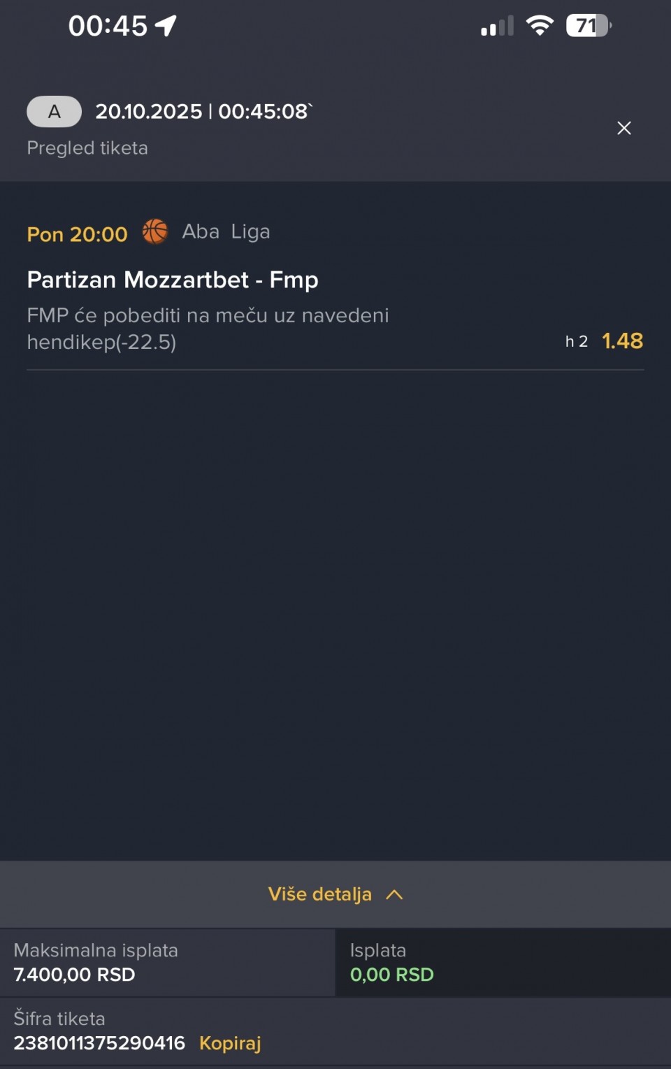 Nekako mi je nerealan ovaj hendikep , sta znam , Partizan se vraca iz Spanije sa duplog kola Evrolige , umroni su. Fmp je imao 9 dana da se odmori i pripremi za ovaj mec koliko...Sutra igram ovaj singl , FMP pobedjuje ili ne gubi vise od 22 razlike.