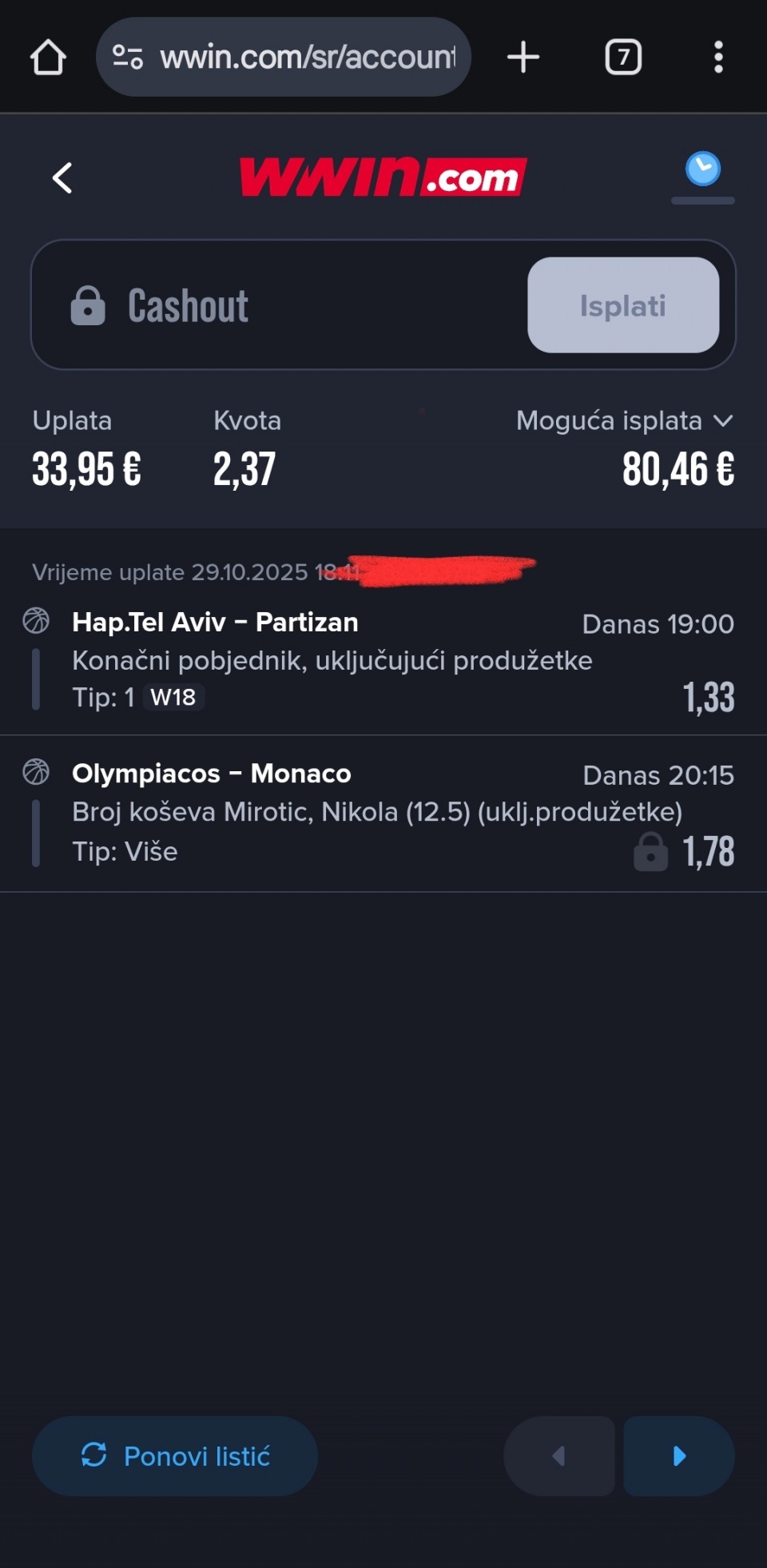 Danas učinak 50:50 zbog 2 poena koja nisu pala na košarci ali šta je tu je, nema šanse da bude niz bez promašaja pa i na ovakav način igre. Za večeras bih ostavio još dva meča i za današnji dan bi bilo dovoljno.