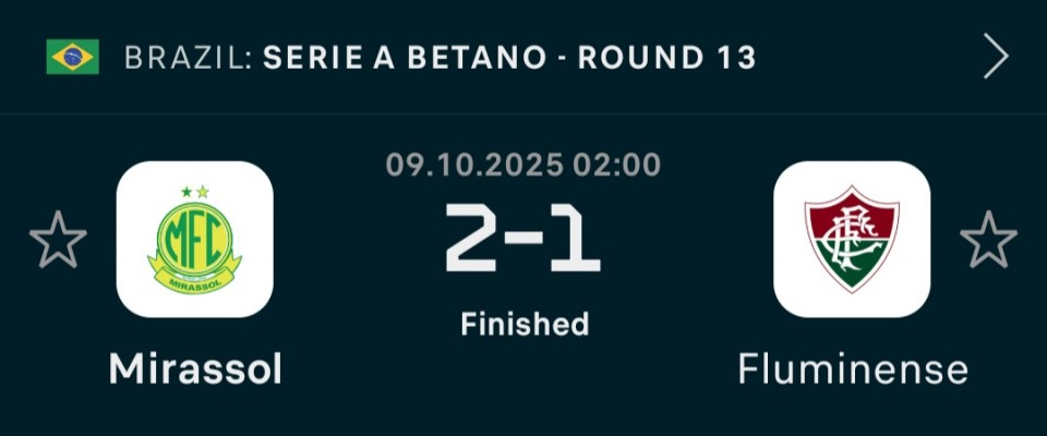 LIVE 12. minut Mirassol - Fluminense 2+ (1.50)