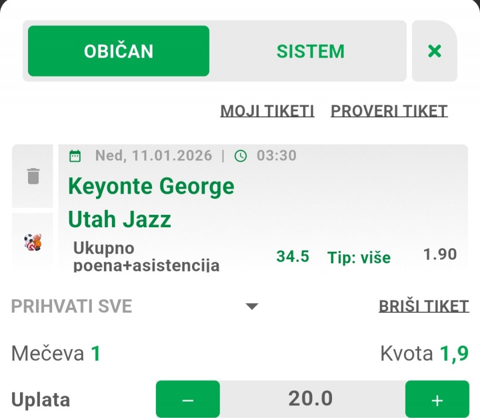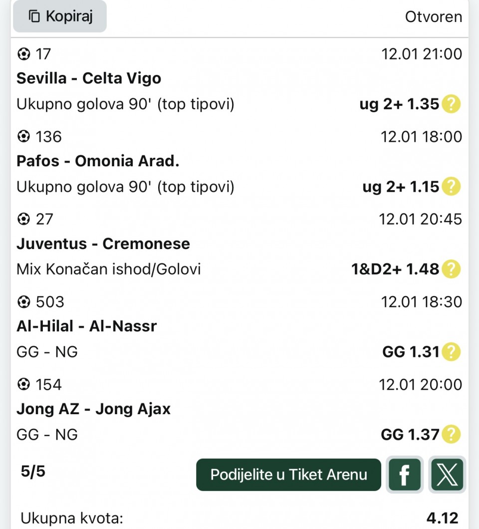 Evo za danas dva tiketa da se isprati ukupne kvote prvi @3.49,