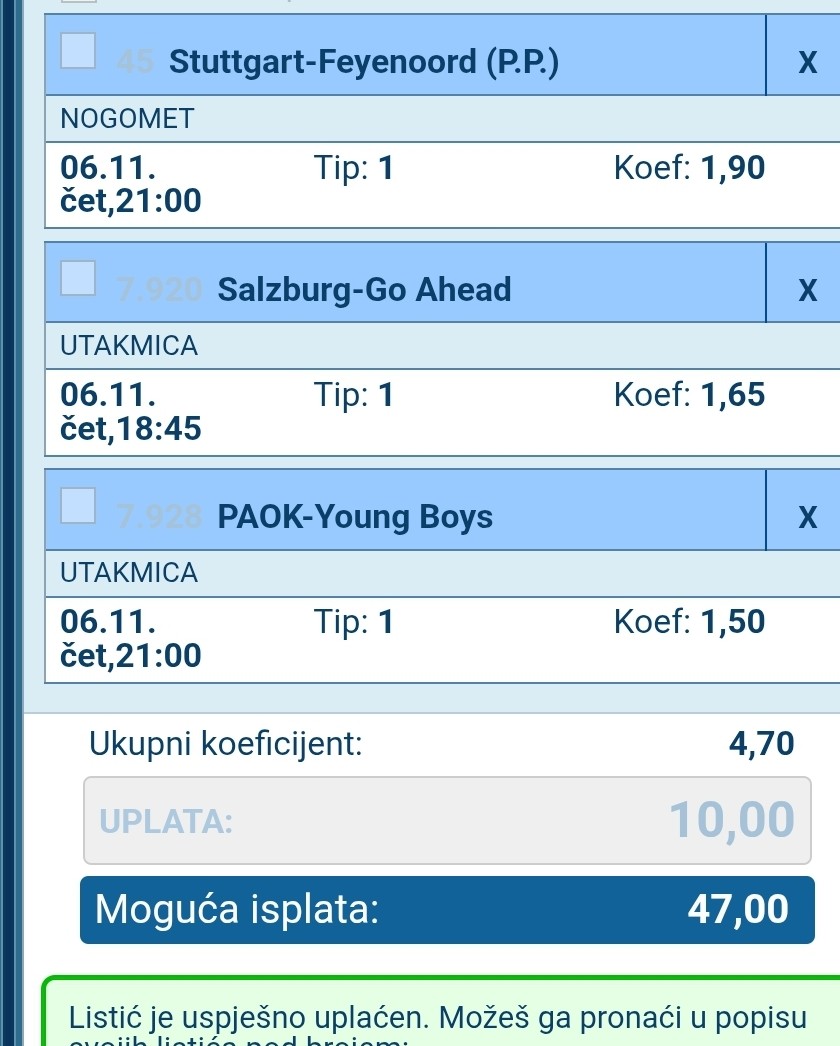 Tiket koji mislim da bi trebao bez ikakvih problema da prodje , postavljam ga sad jer ocekujem pad kvota u naredna dva dana.