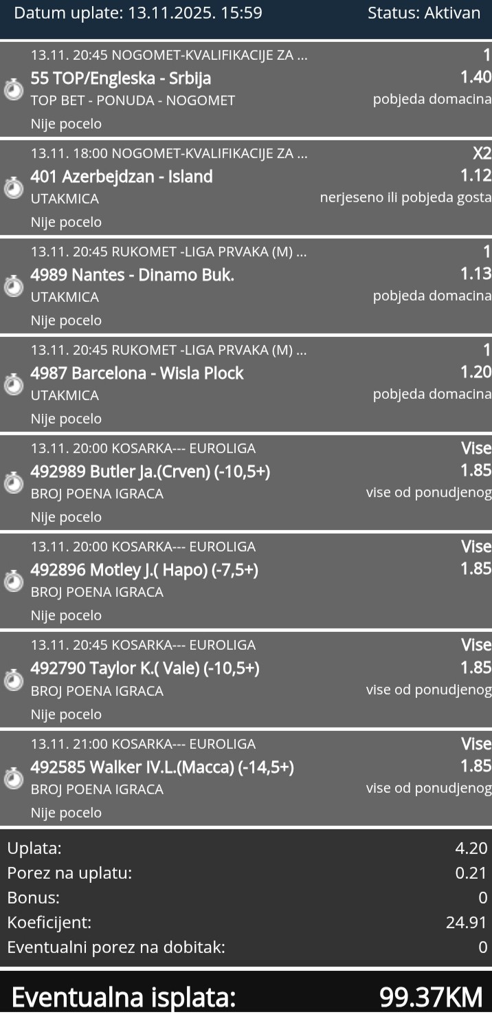 Nazalost, obe prijateljske neefikasne. Informacije oko izostanaka bile su tacne. E sada moramo da uzmemo u obzir da su prijateljske utakmice u pitanju i da je sve moguce, kao u ovom slucaju, malo golova. Pauziram sa predlozima do sutra, jer danas...Nazalost, obe prijateljske neefikasne. Informacije oko izostanaka bile su tacne. E sada moramo da uzmemo u obzir da su prijateljske utakmice u pitanju i da je sve moguce, kao u ovom slucaju, malo golova. Pauziram sa predlozima do sutra, jer danas nemam volje da igram bilo sta. Zdravi bili, pozdrav! Show more