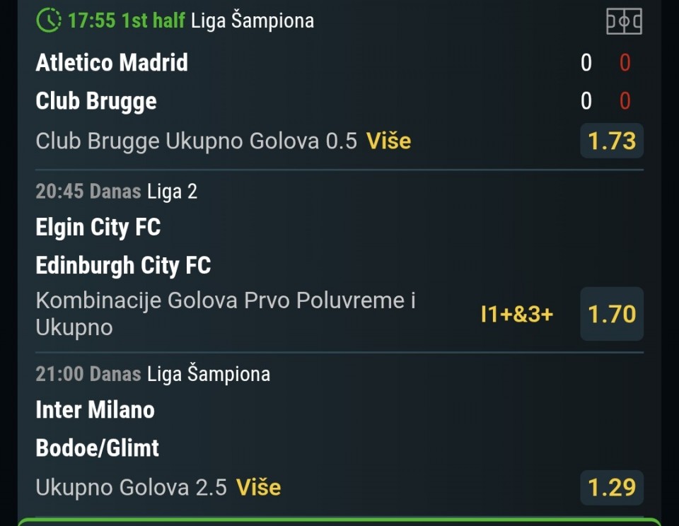 Inter kormilari talijanskom ligom i sada moze sav fokus da prebaci na sustizanje rezultata.Vrlo su potentni u napadu a Bodo,koliko god je iznenadjenje sezone,je jedna ekipa na domacem a druga na gostujucem terenu.Pobjeda protiv Atletiko Madrida u gostima mislim da vise govori o Atletiko Madridu nego o njima.Inter mora sustici 2 gola razlike i vise vjerujem u njihov napad nego u odbranu,tako da mi je prva opcija da daju gol u oba poluvremena.
